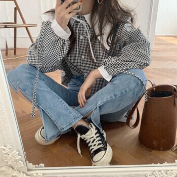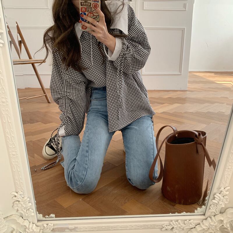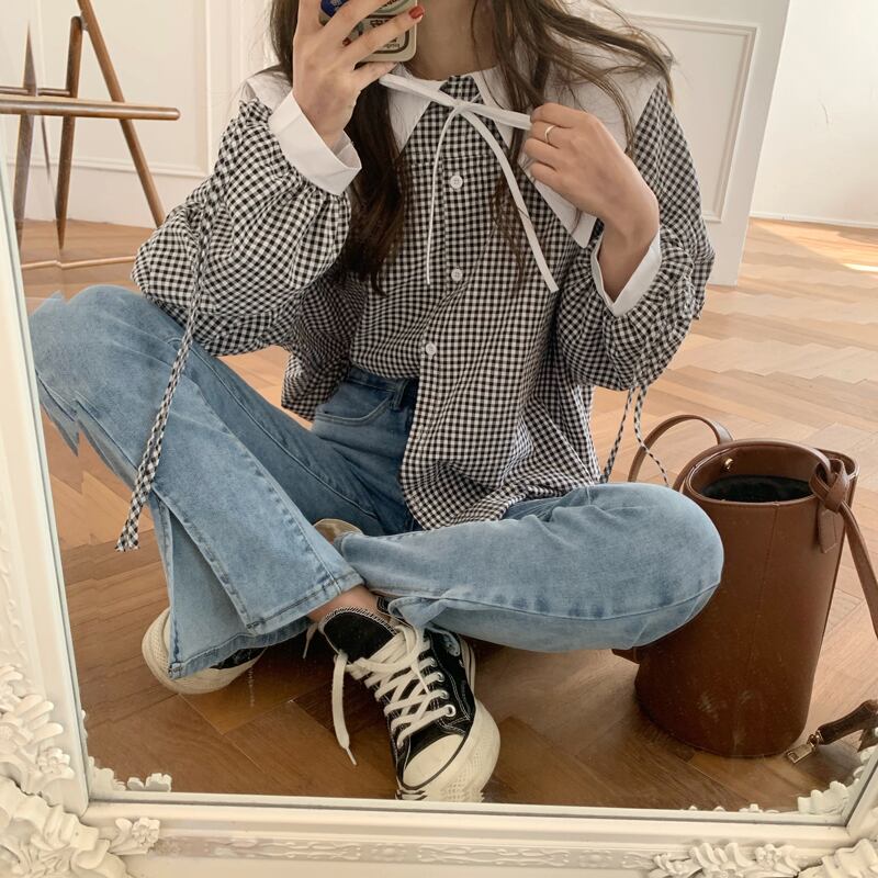スタンダードカラーレースシャツ スプリング格子柄ルーズレディース ロング レトロ 春物 ビッグFスモールZ韓国31955877447