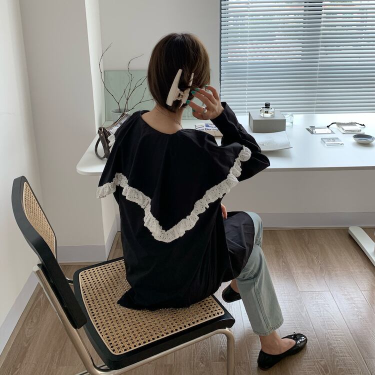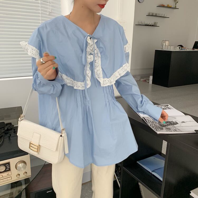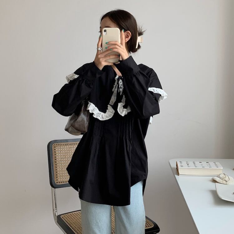 レースカラーシャツ ルーズ長袖スリーブトップス レディース ロング ビッグFスモールZ韓国41718044962