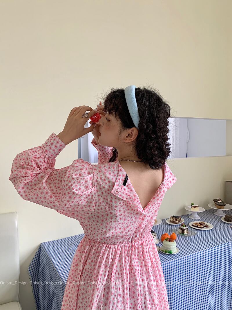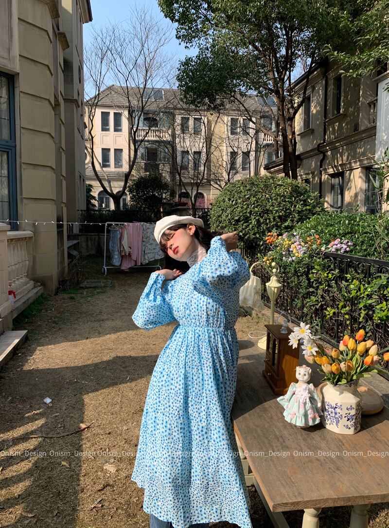 バックボタンフローラルスカート ルーズ長袖スリーブスプリングラウンドネックドレス ロング 春物 花柄 Oネック ビッグFスモールZ韓国1128853181