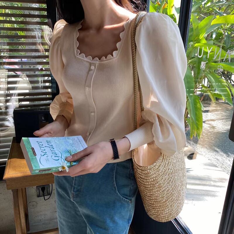 スタンダードメッシュスリーブニットセーター レーススプリングトップス レディース レトロ 大人ガーリー スウィート キュート カジュアル 春物 スクウェア ステッチ ビッグFスモールZ韓国10193879927