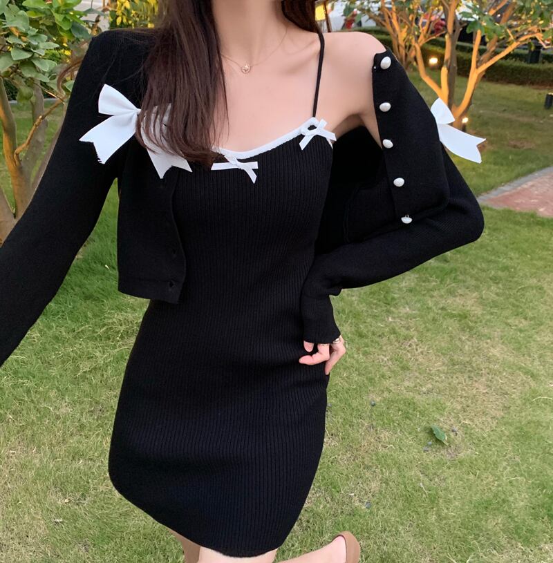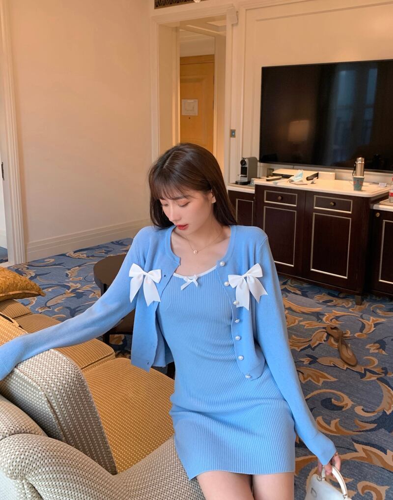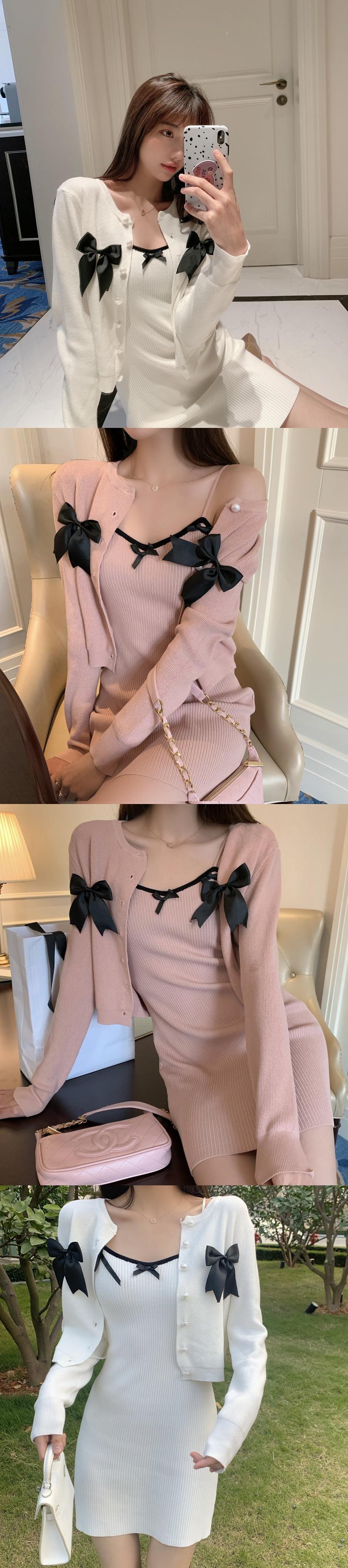 ショートニットカーディガンスリムスカート レディース リボン ビッグFスモールZ韓国10507384062