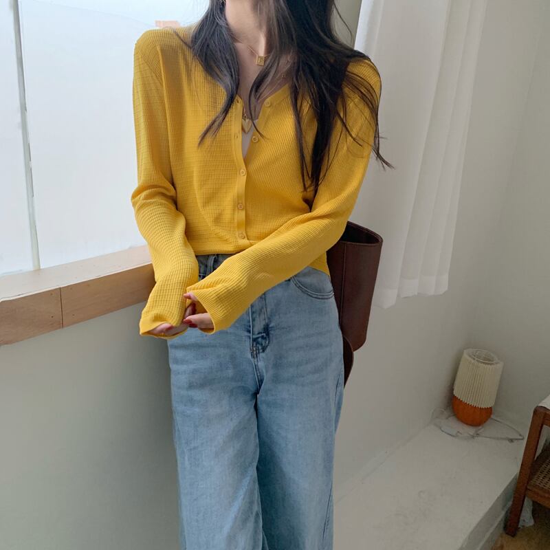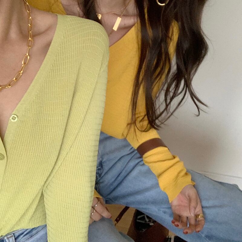 Vネックカーディガンスプリングボタンニットトップス レディース レッド 春物 ビッグFスモールZ韓国82883395786