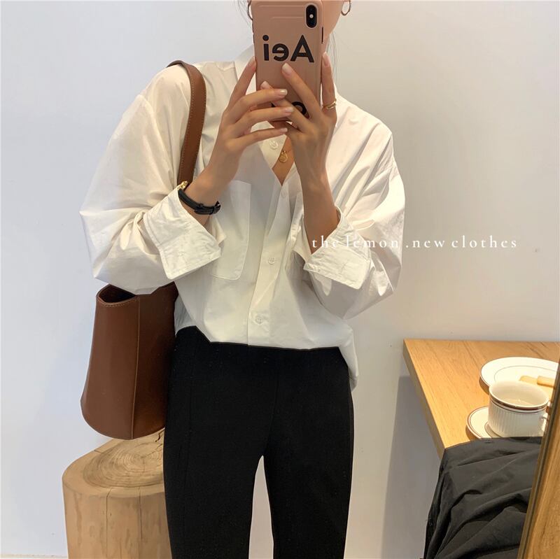 ベーシックポケットシャツ ルーズスプリング長袖スリーブトップス レディース ロング 春物 ビッグFスモールZ韓国91870028268