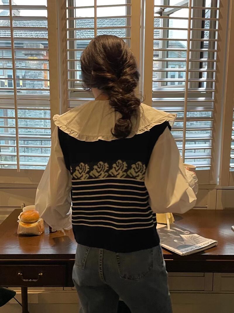 Flowerデザイン ストライプVネックスプリングニットトップス レディース 春物 フラワーデザイン ビッグFスモールZ韓国64449020871