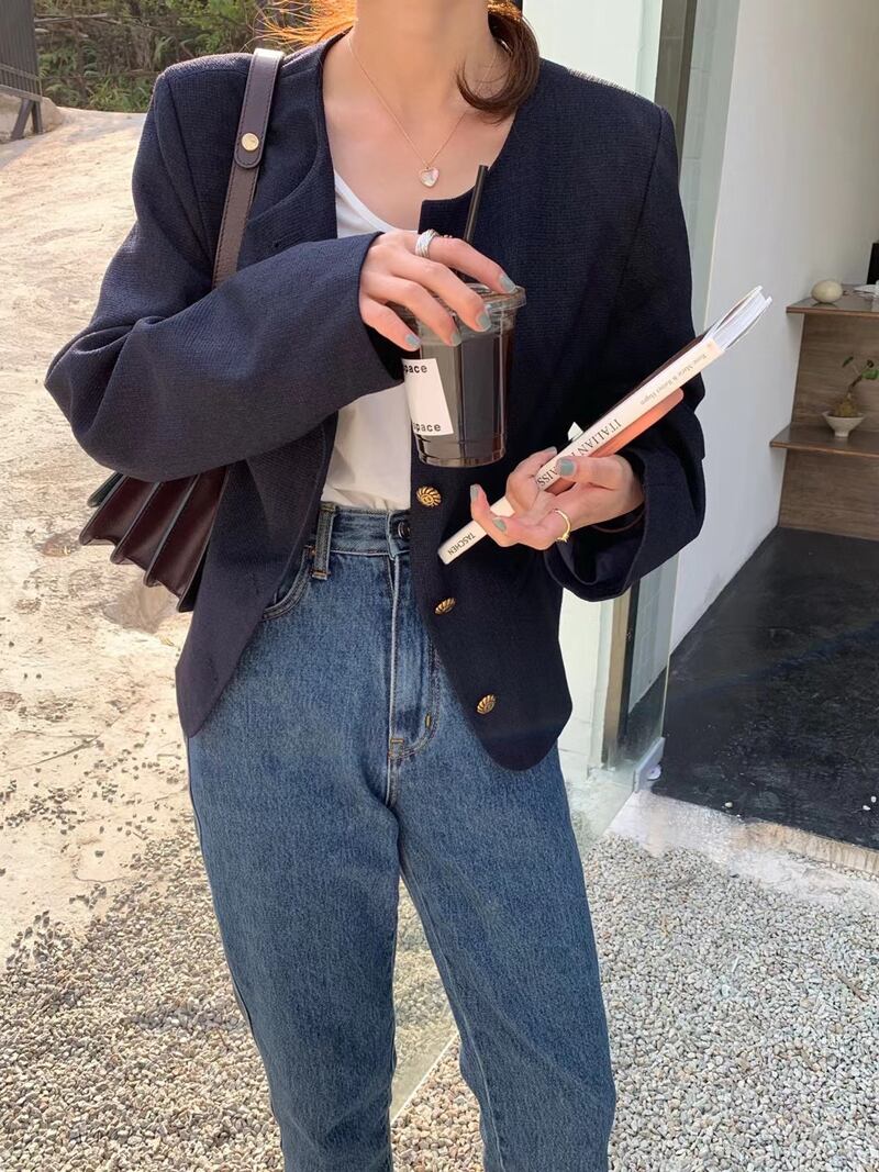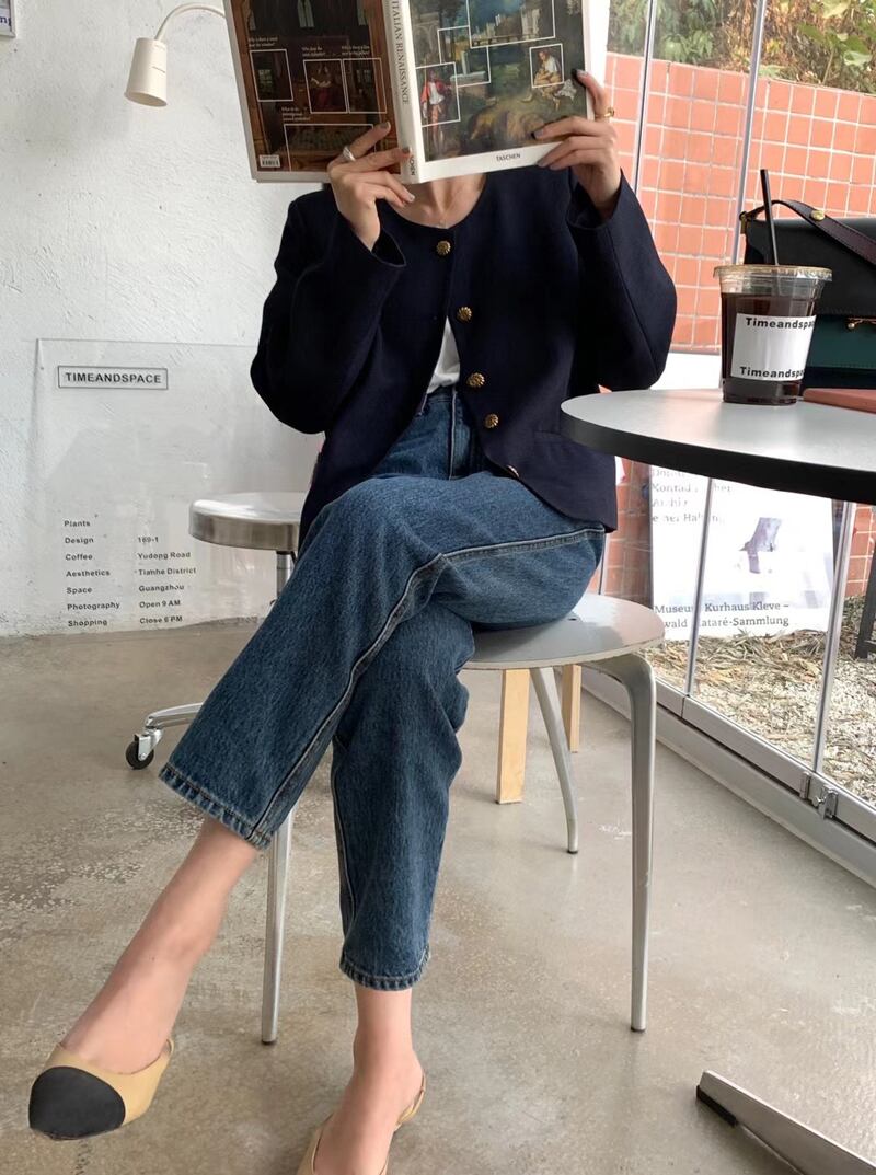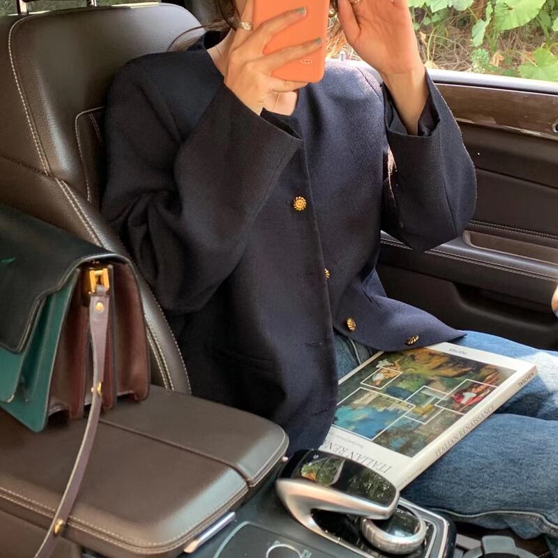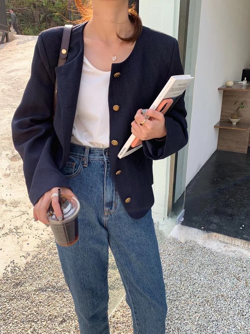 ボタンラウンドネックジャケット スタンダードスプリングショートトップス レディース レトロ 春物 Oネック ビッグFスモールZ韓国98269256692