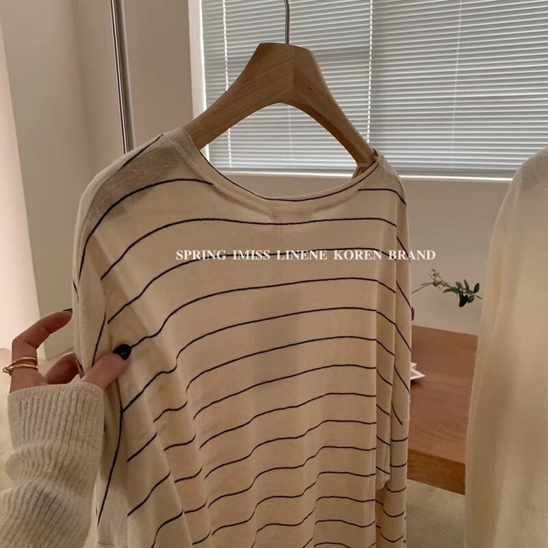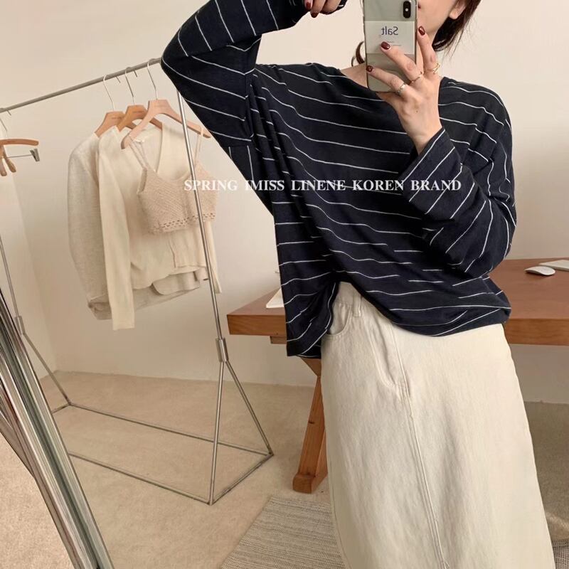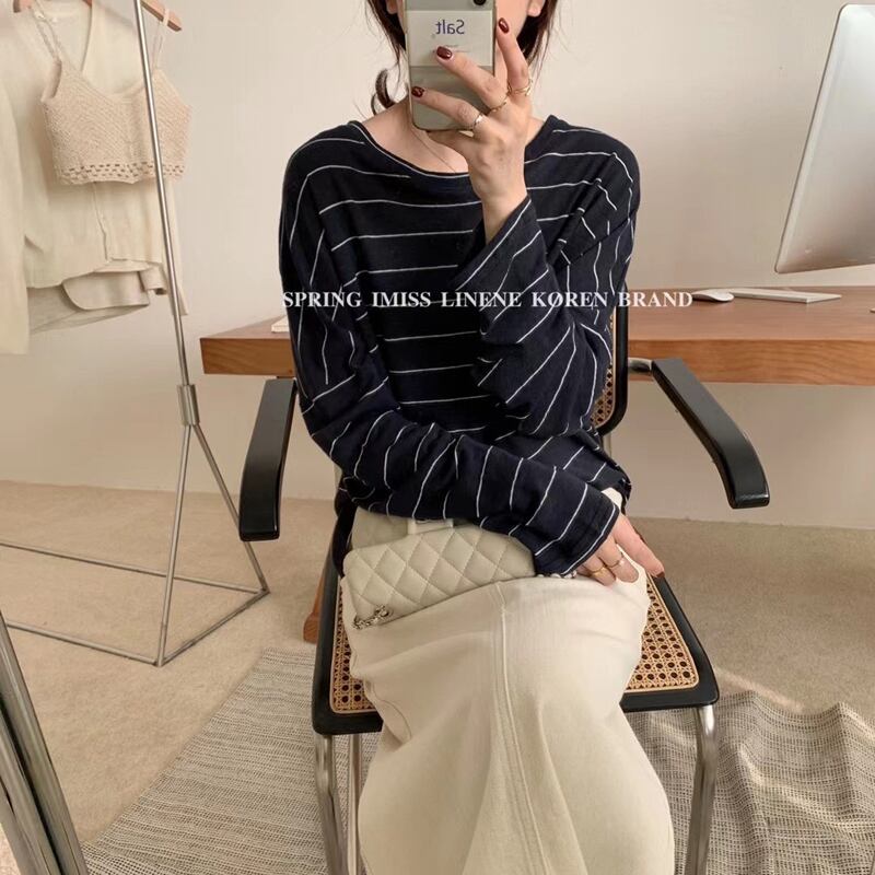ラウンドネックストライプ長袖スリーブTシャツ トップス スプリングレディース ロング 春物 Oネック ビッグFスモールZ韓国97502702941