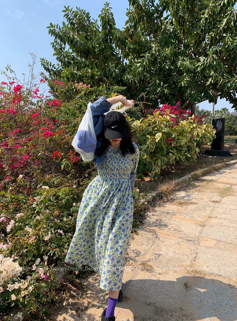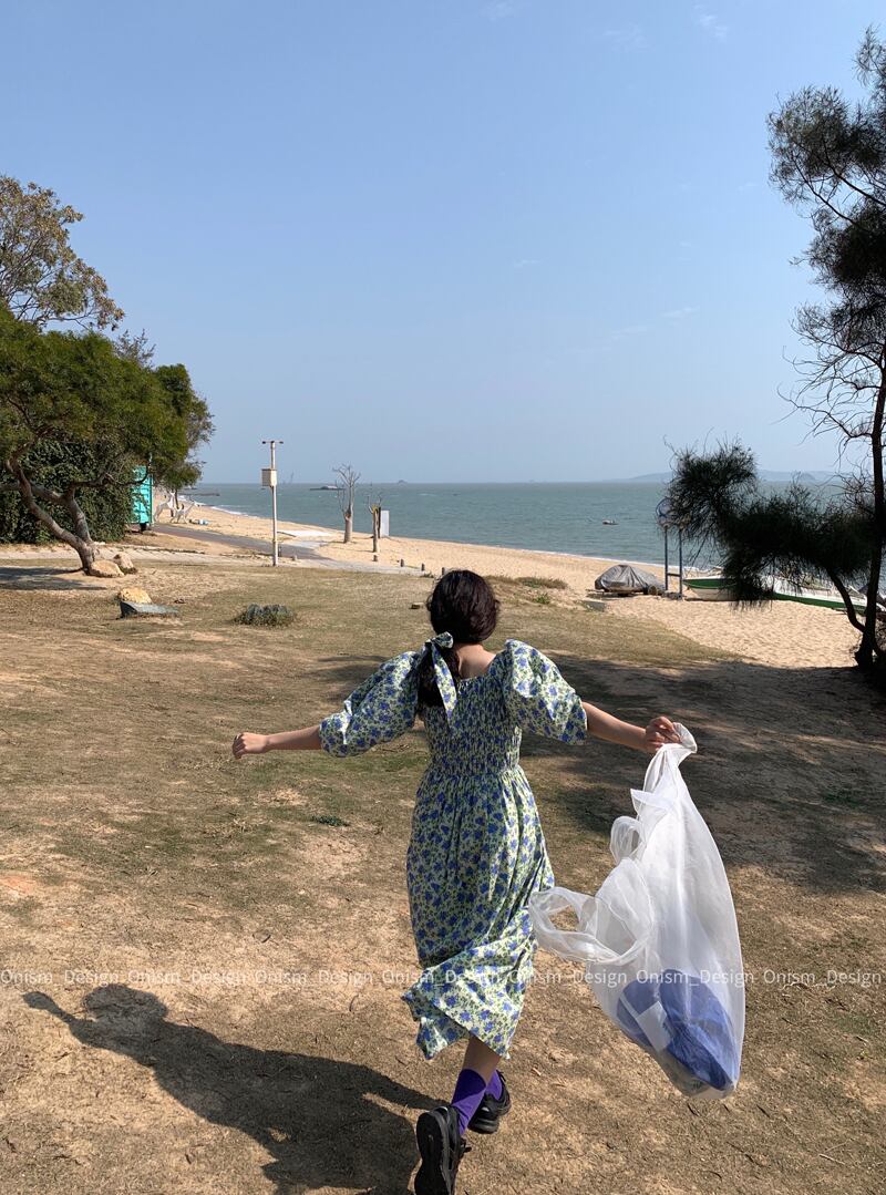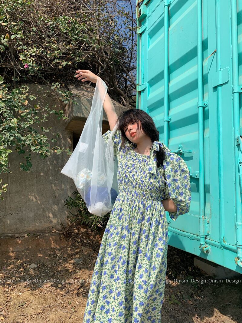 スタイルプリーツスリーブフローラルスカート スプリングウェストドレス ロング 春物 花柄 スクウェア ビッグFスモールZ韓国77013379796