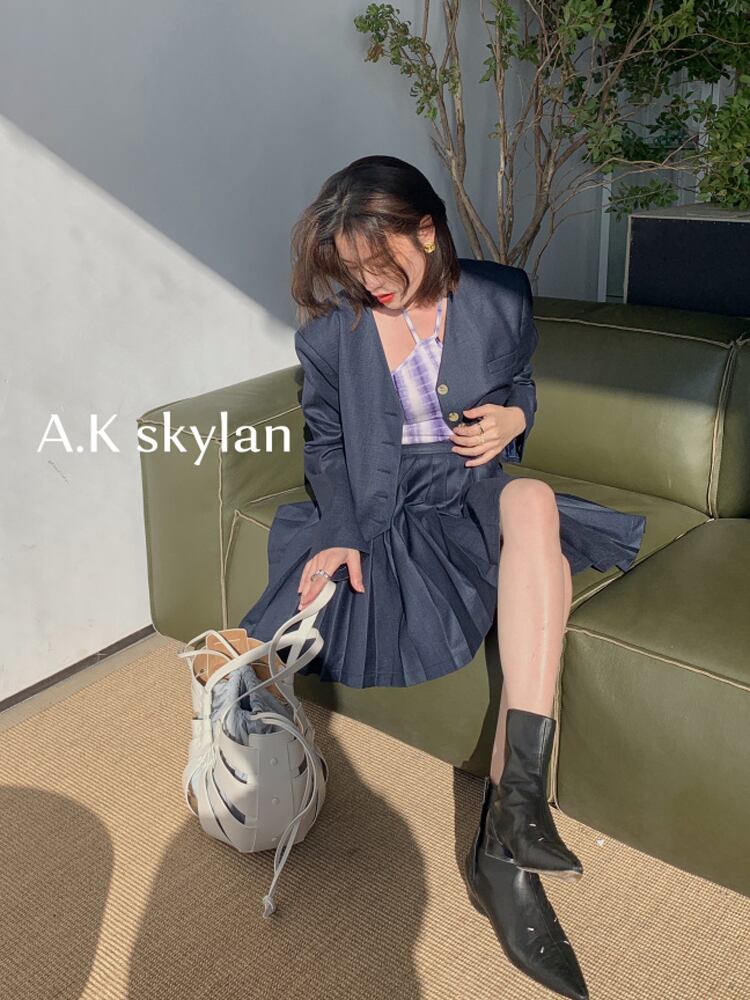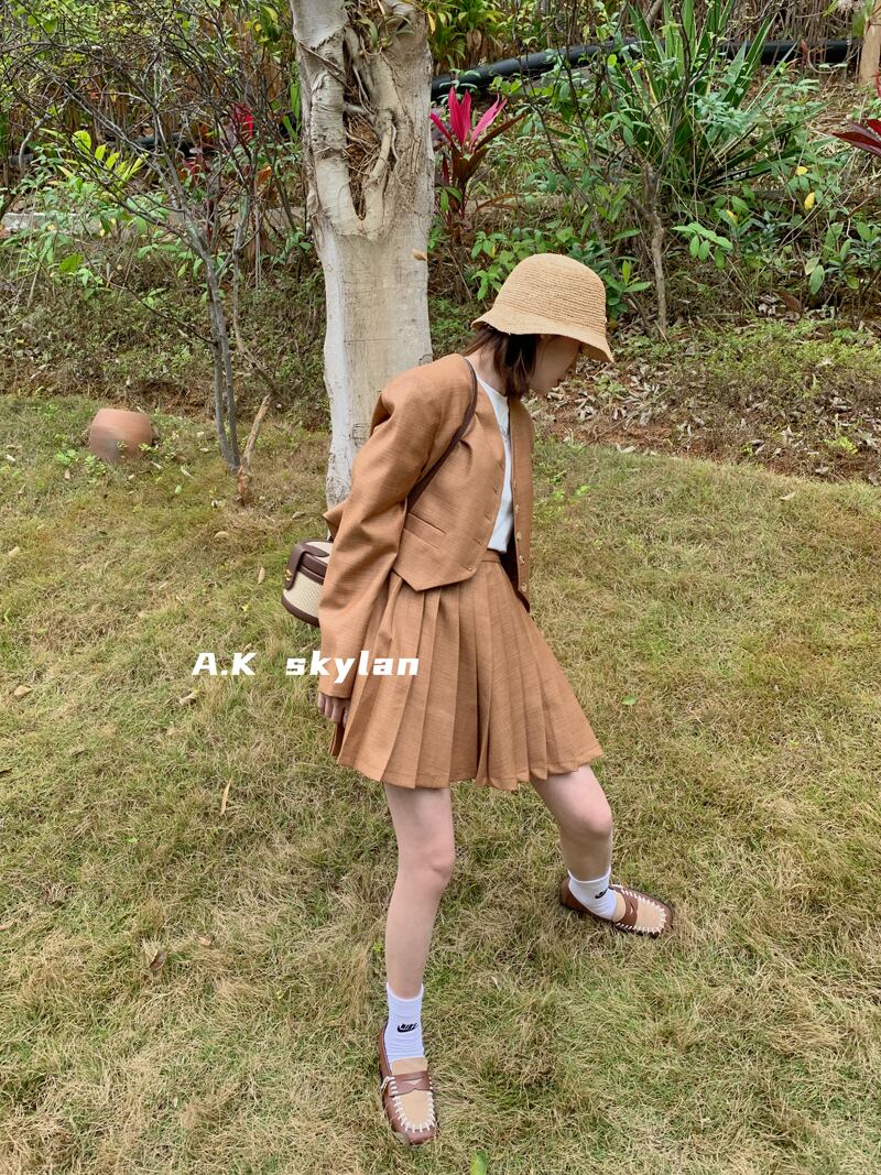 Vネックショートジャケット ウェストプリーツスカート Aライン レトロ ビッグFスモールZ韓国57495568509