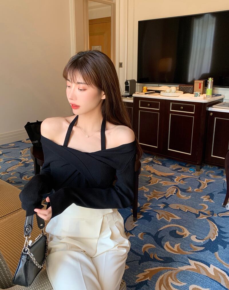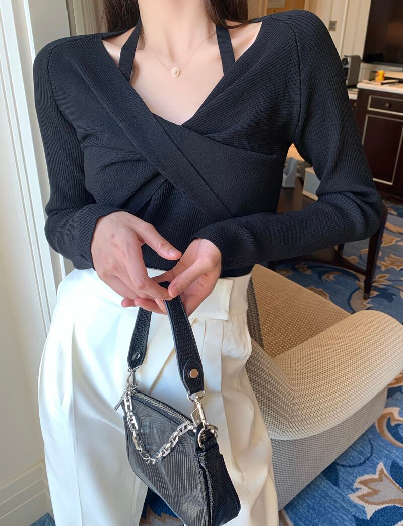 薄手ホルタークロスニットソリッド カラープルオーバー スプリングレディース ブラウス 春物 ソリッドカラー ビッグFスモールZ韓国19737346602