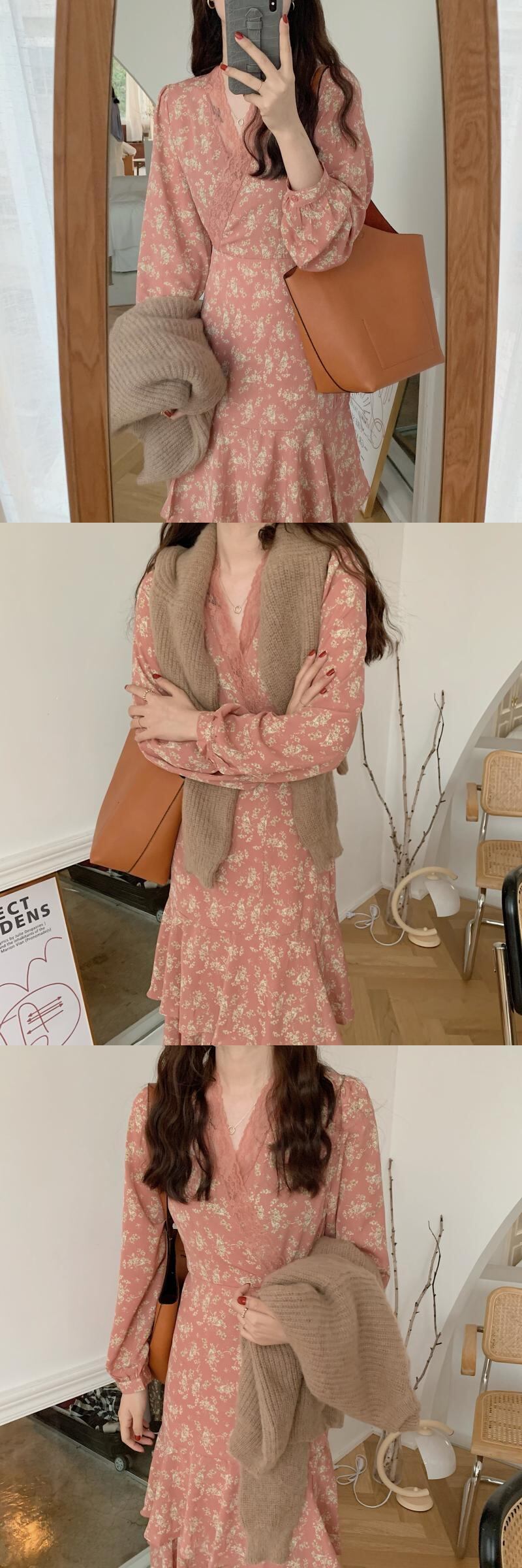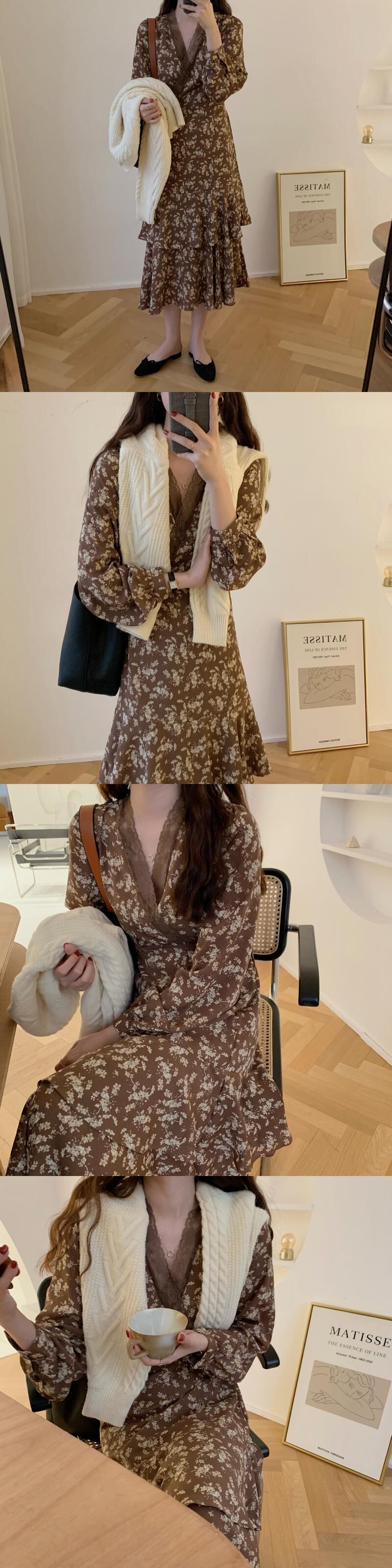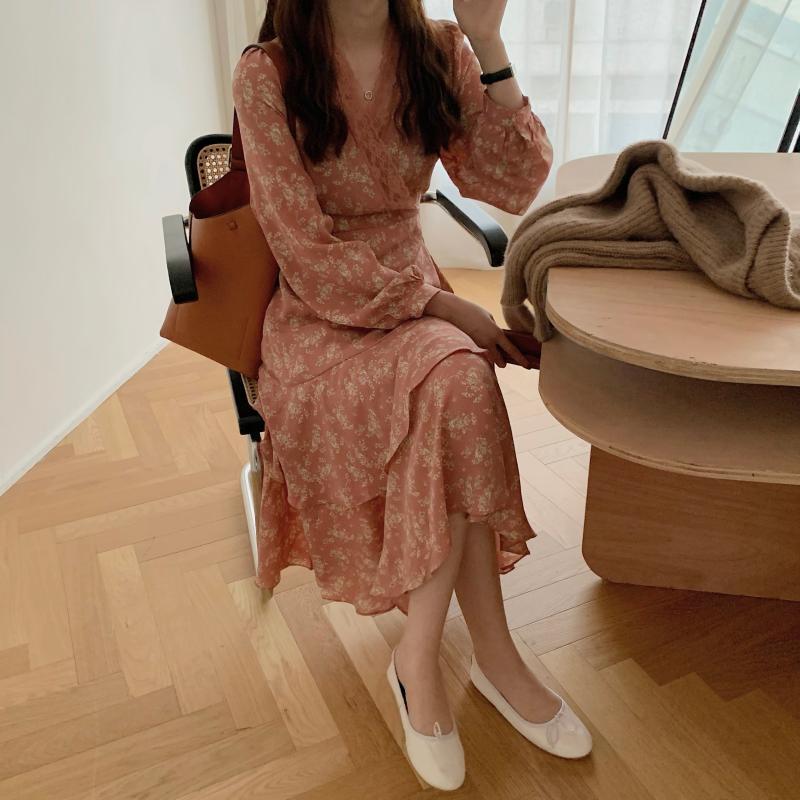 レースクロスVネックフローラルスカート 薄手ウェスト長袖スリーブドレス ロング 花柄 ビッグFスモールZ韓国18425671141
