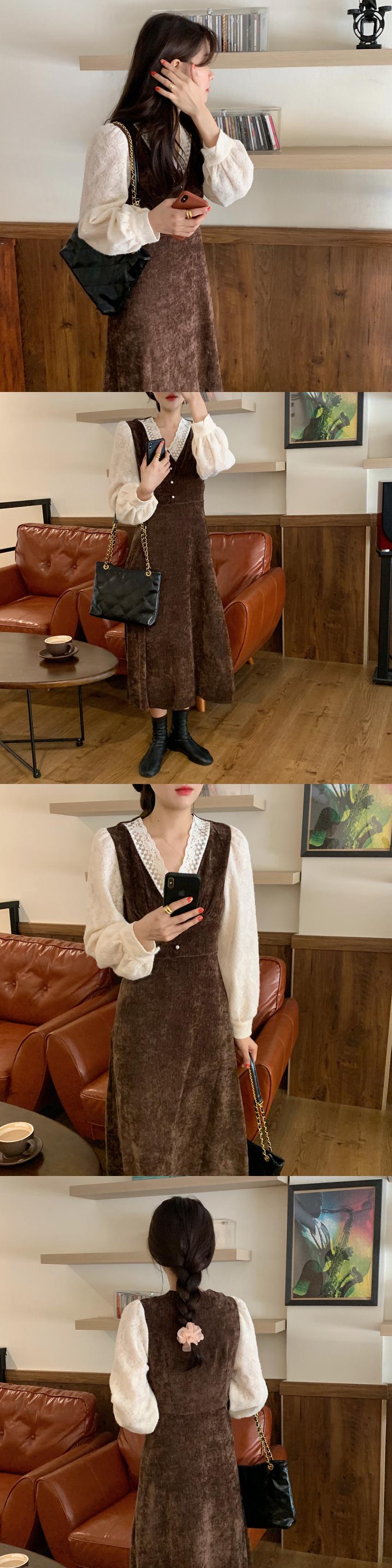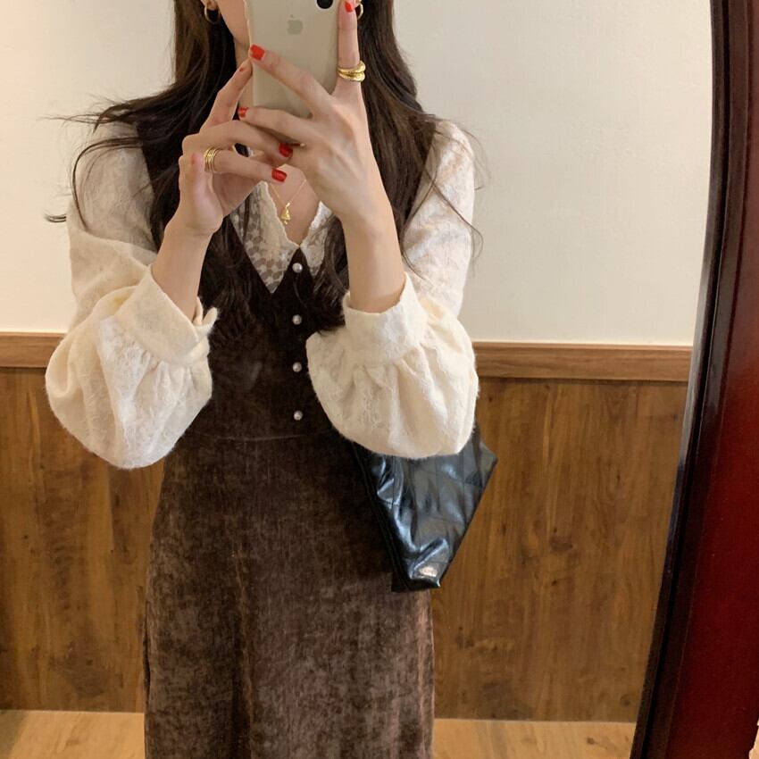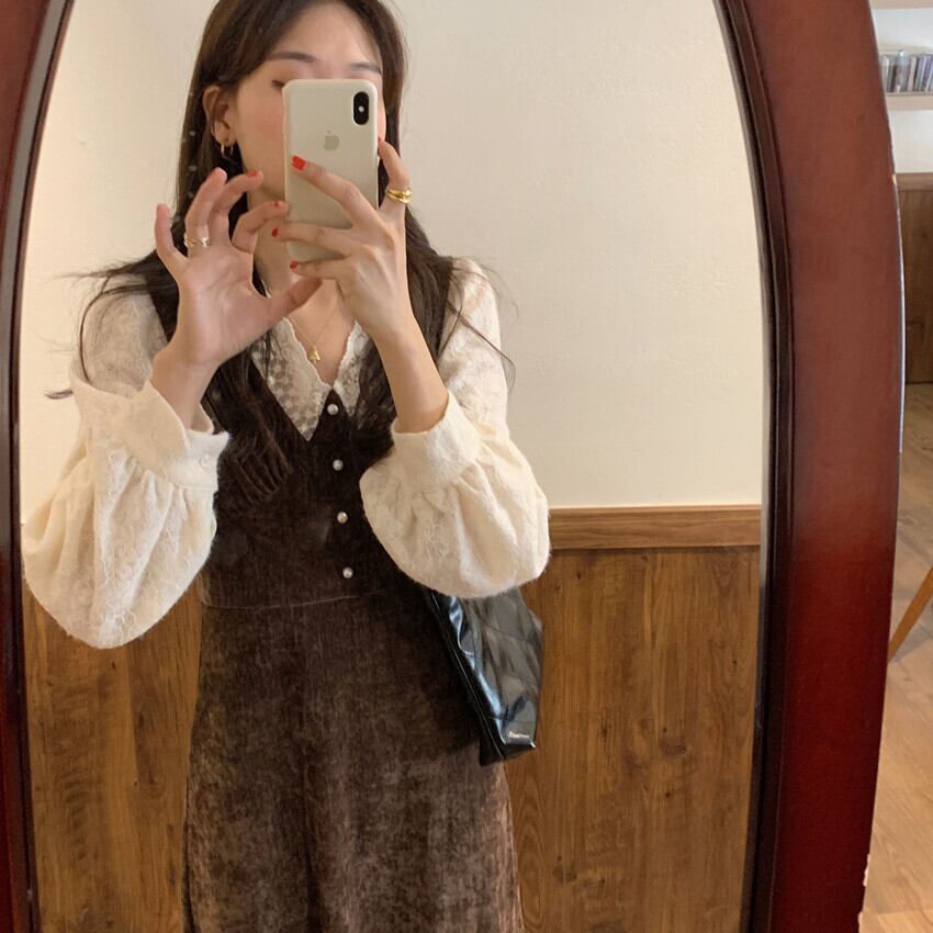 スタンダードレースVネックベルベットスカート 薄手長袖スリーブドレス レディース ロング レトロ ステッチ ビッグFスモールZ韓国51121060061