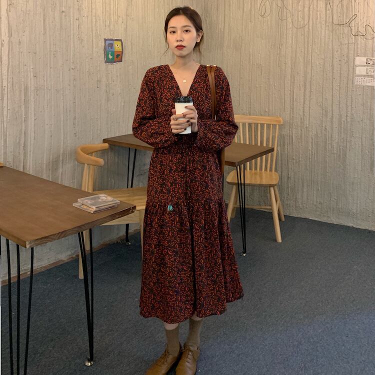 スタンダードウェストフローラルスカート 薄手Vネックスプリングドレス レディース ロング レトロ 春物 花柄 ビッグFスモールZ韓国58384089780