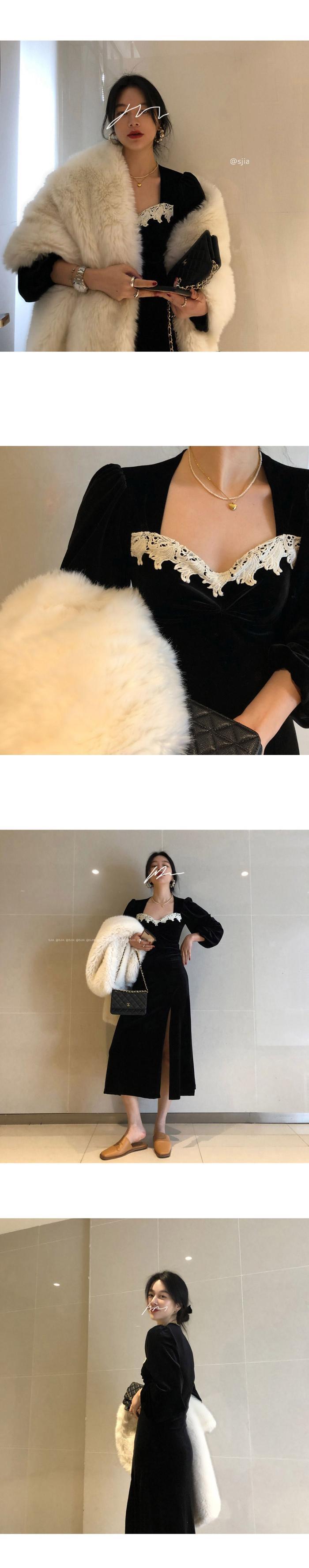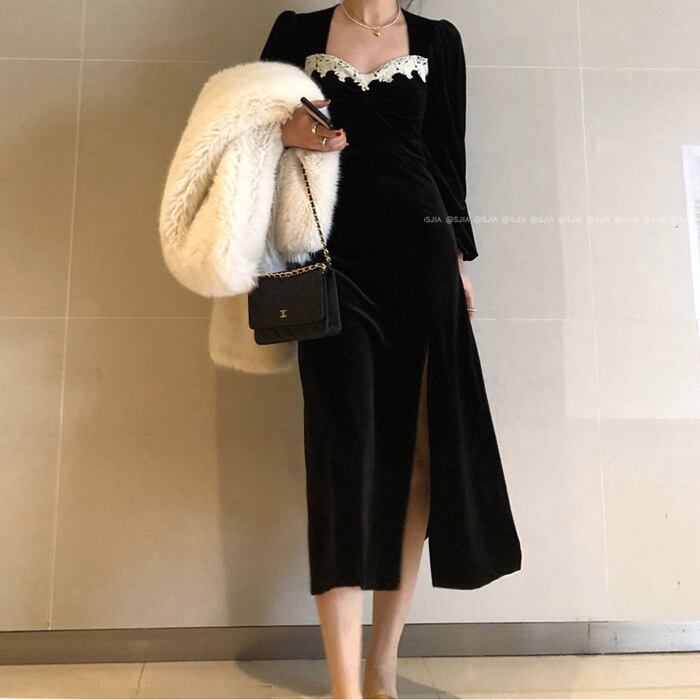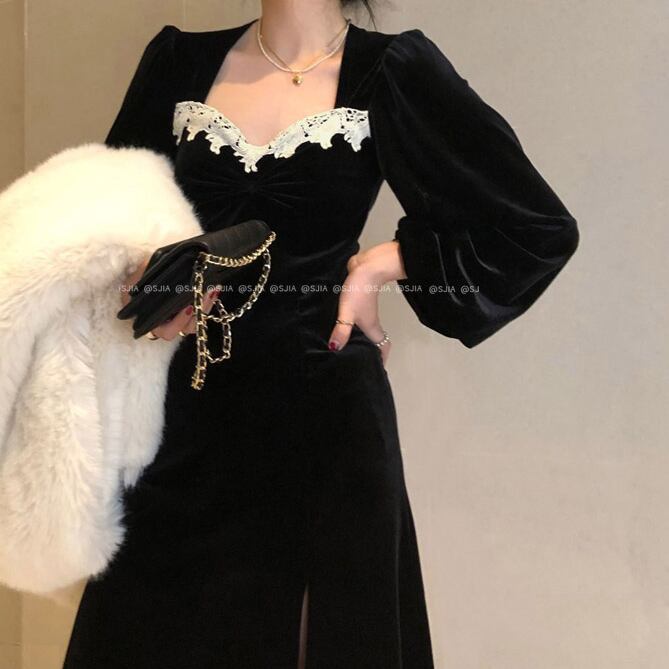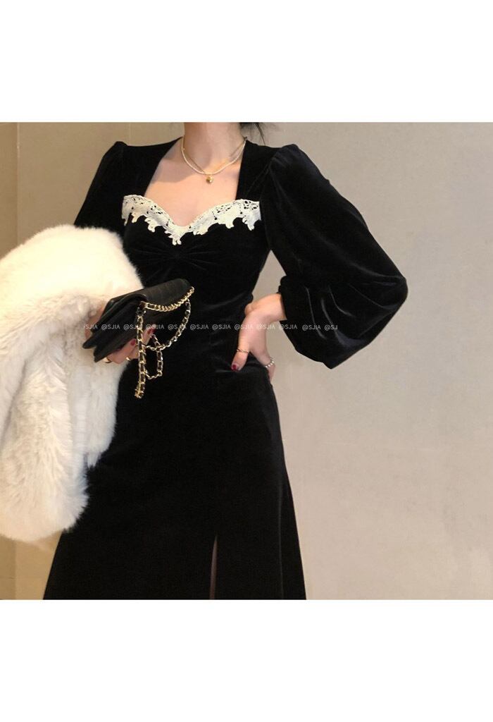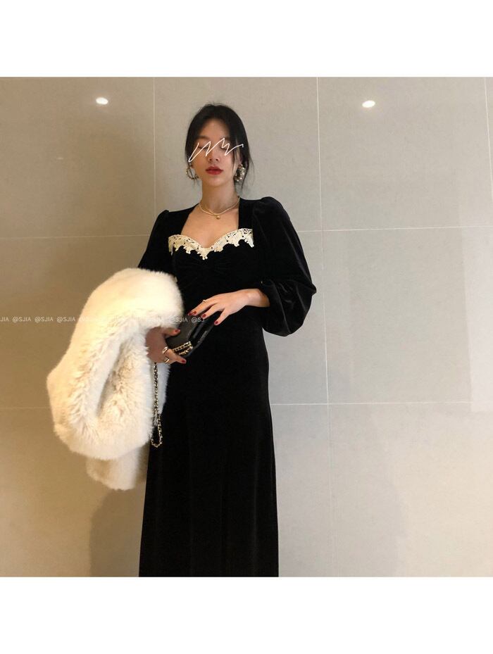 レースベルベットスカート スタンダードスリット長袖スリーブドレス ロング レトロ スクウェア ステッチ ビッグFスモールZ韓国26678938244