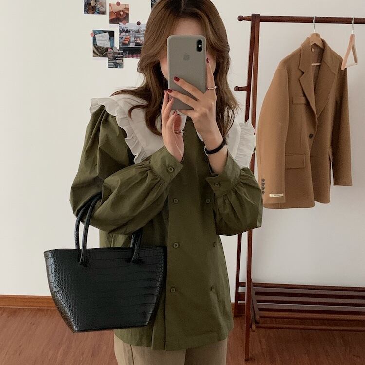 ダブルブレストシャツ カラーレーススリーブトップス レディース ロング ビッグFスモールZ韓国78689175933