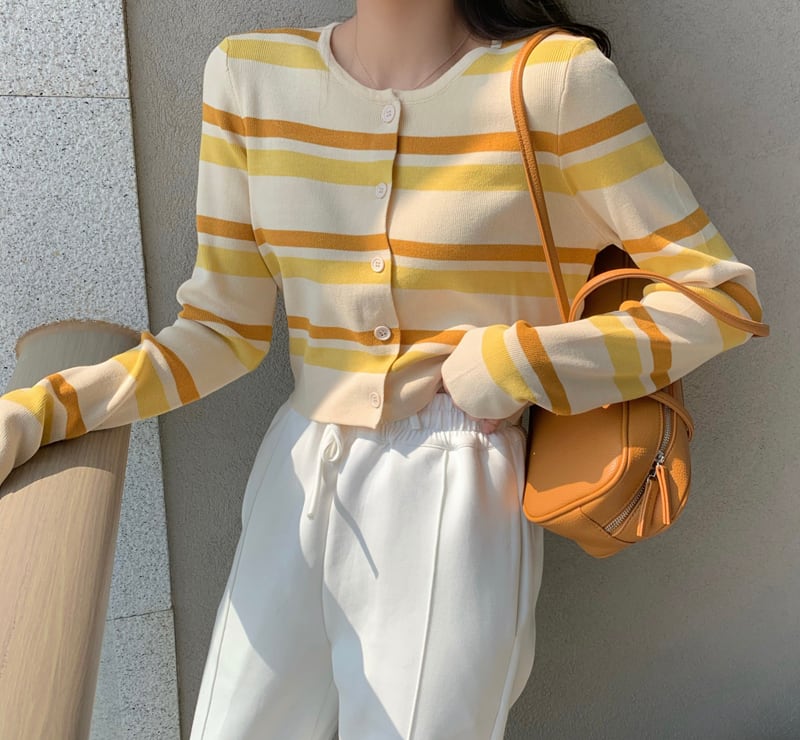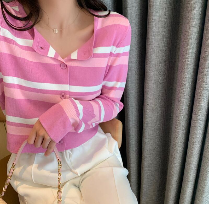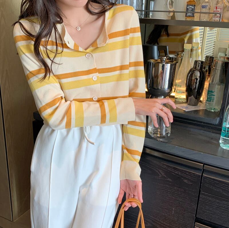 ストライプニットセーター ラウンドネックボタンカーディガンスプリングシングルトップス レディース 春物 Oネック ビッグFスモールZ韓国42631271706