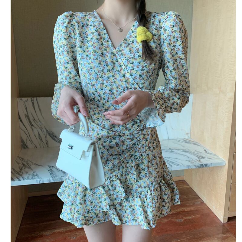 サイドボタンクロスVネックフローラルスカート 薄手レースショートスプリングドレス 春物 花柄 ビッグFスモールZ韓国30267194304
