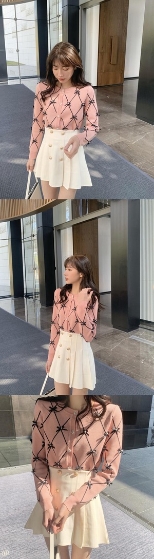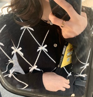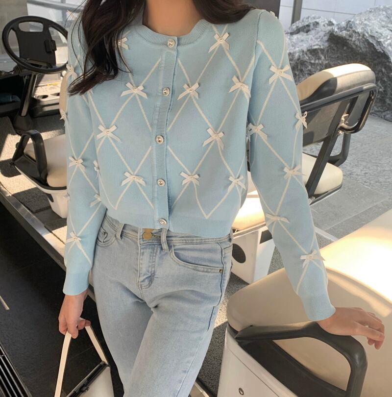 ラウンドネックカーディガンスプリングブレストニットセーター リボン 大人ガーリー スウィート キュート カジュアル 春物 Oネック ビッグFスモールZ韓国54198882240