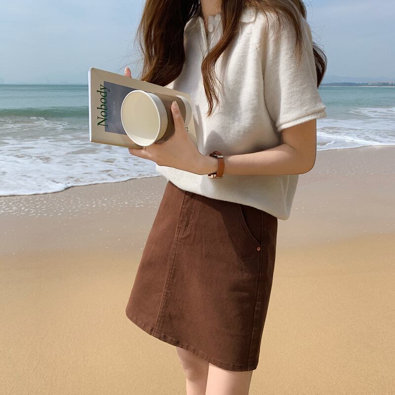 スタンダードカラースカート ハイウェストウェスト薄手Aラインソリッド ショート レトロ ソリッドカラー ビッグFスモールZ韓国87854601264