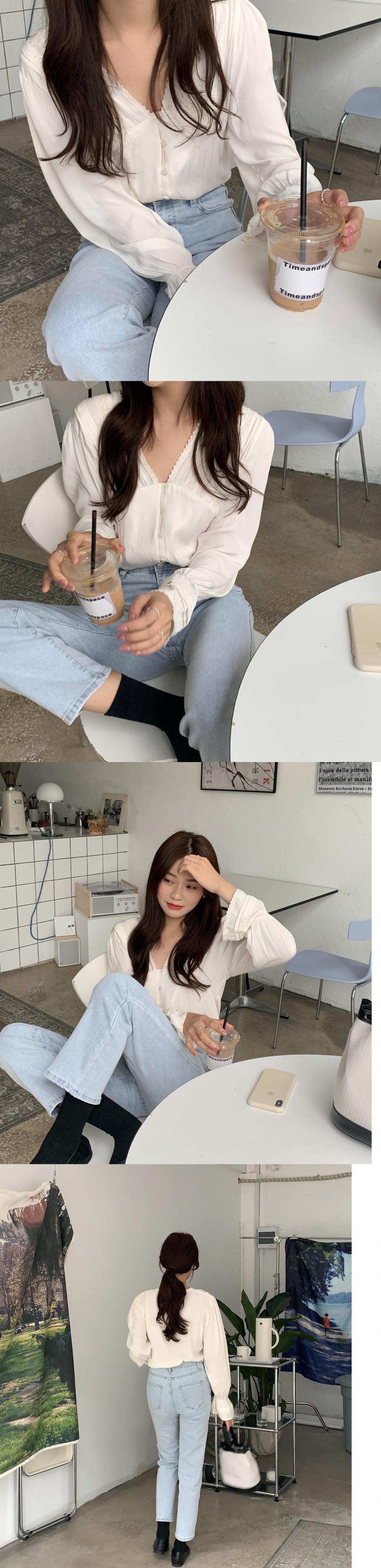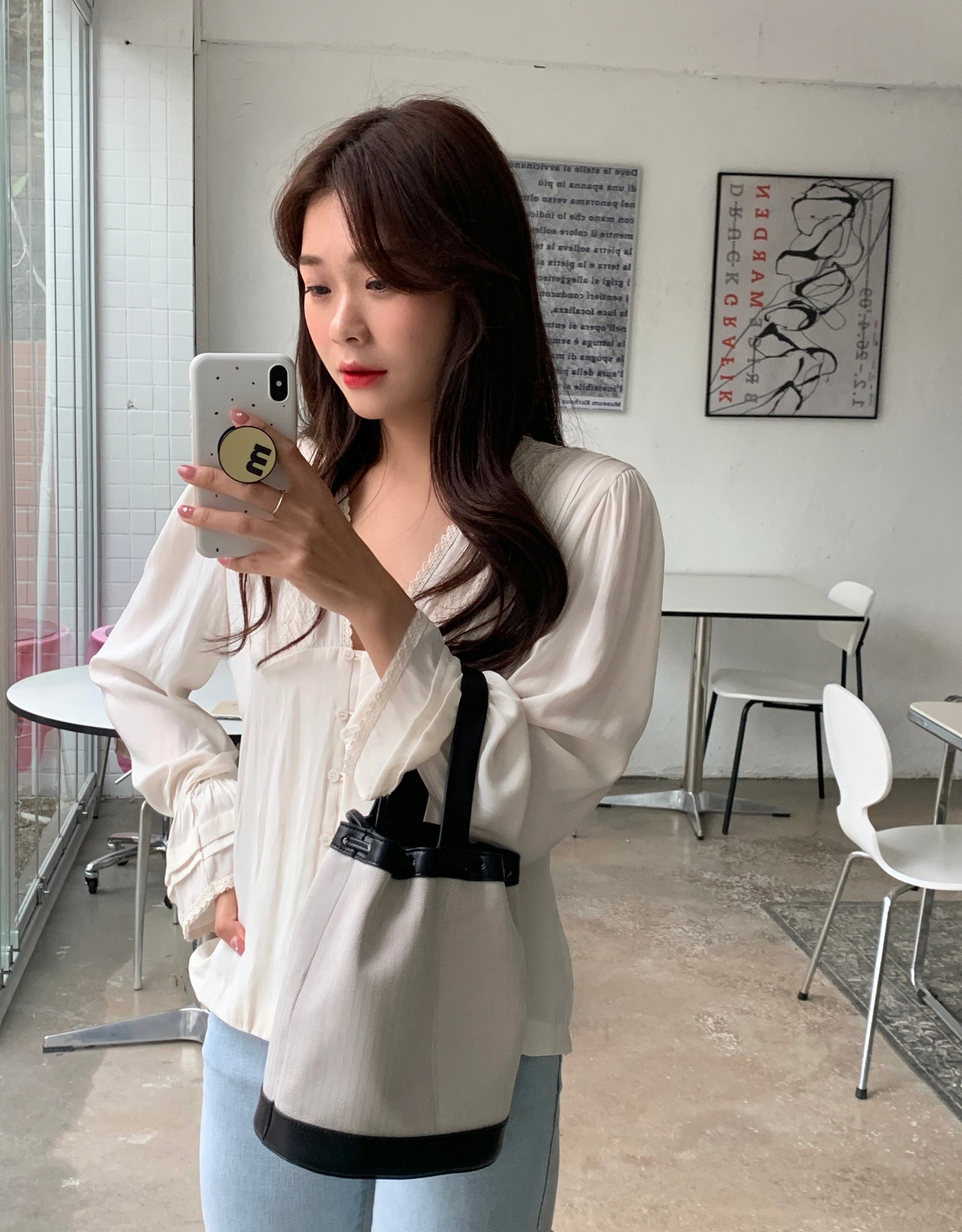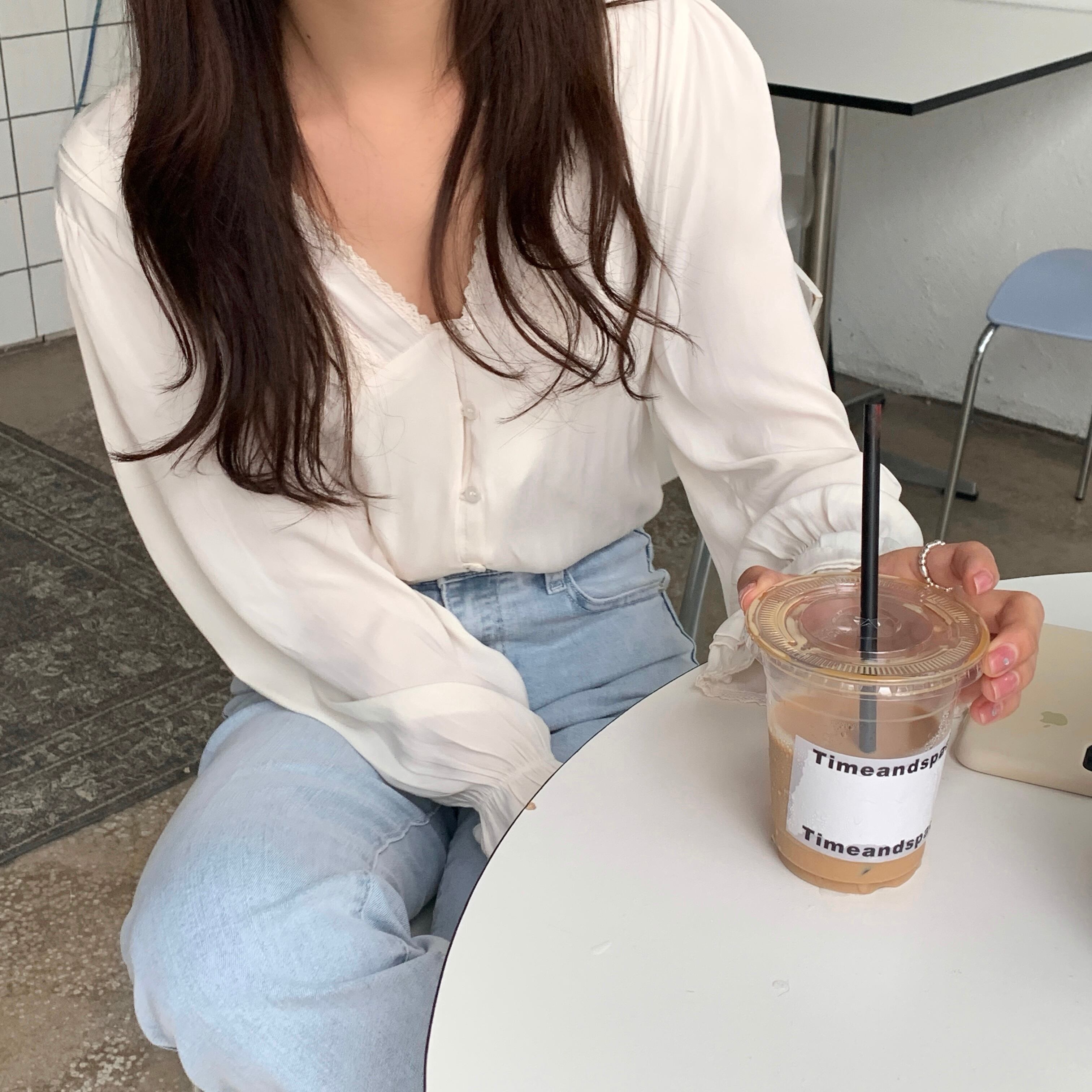 スタンダードレースVネック長袖スリーブシャツ スプリングトップス レディース ロング レトロ 春物 ビッグFスモールZ韓国21028718591