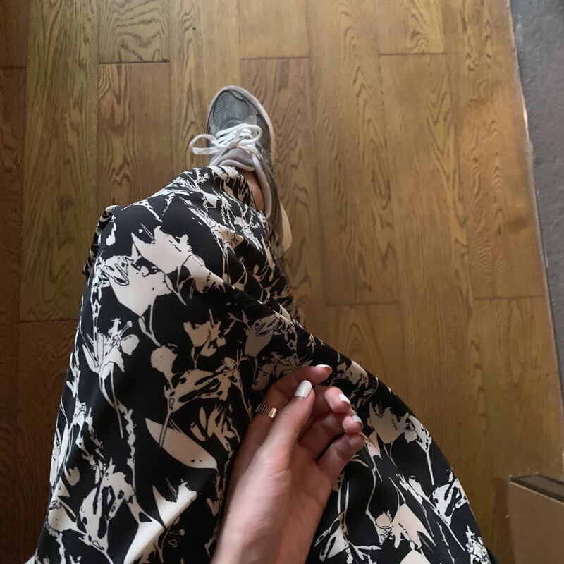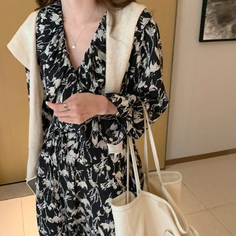 スタンダードフローラルスカート Vネックウェストロングドレス スプリング レトロ 春物 花柄 ビッグFスモールZ韓国43165141680