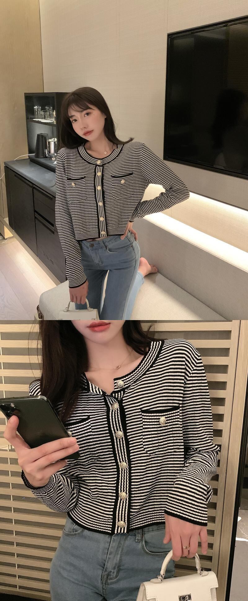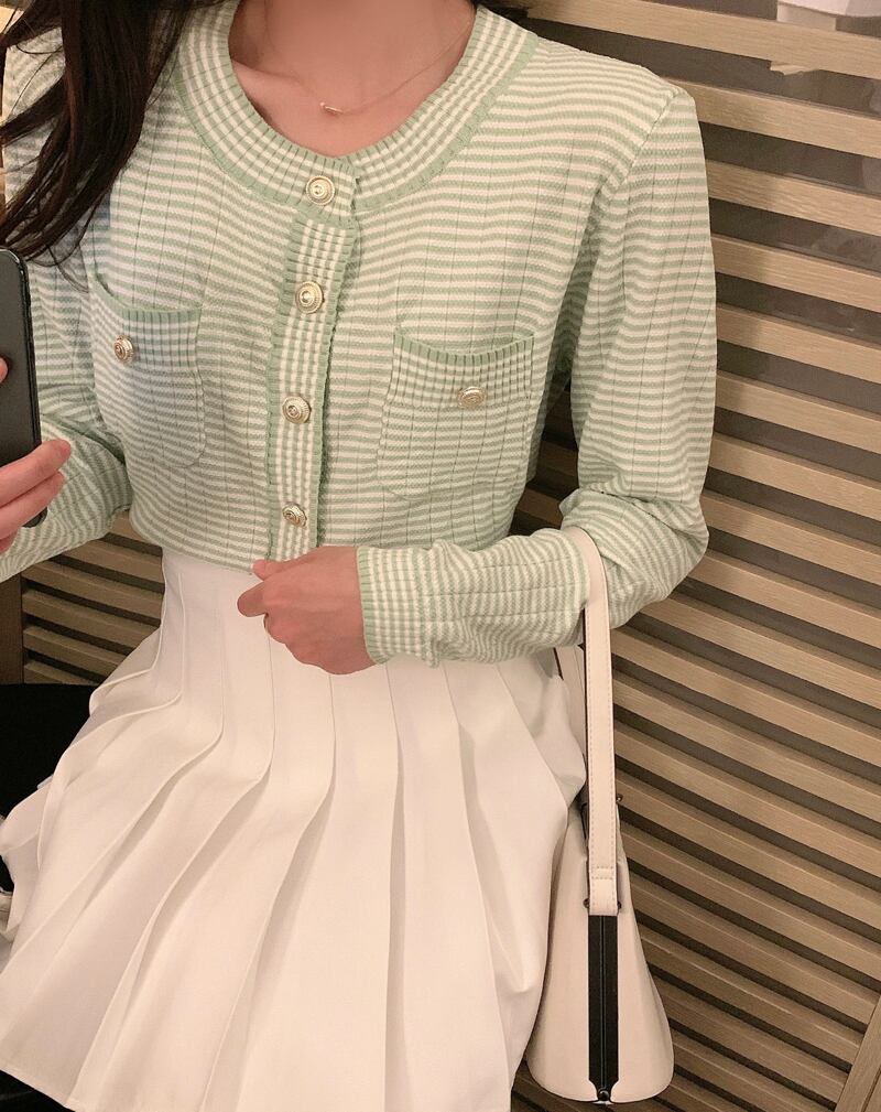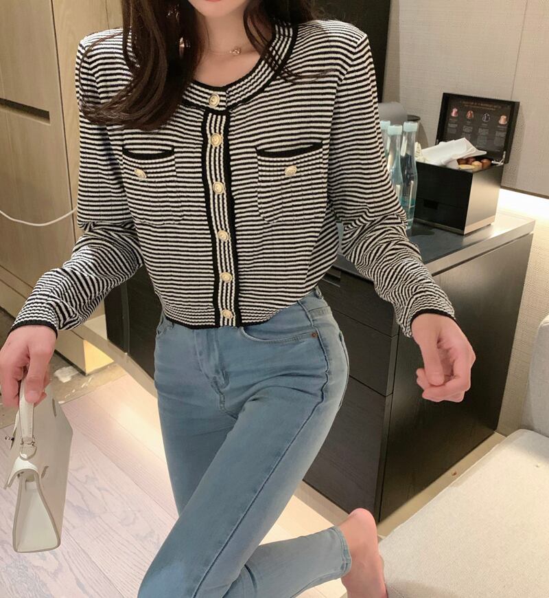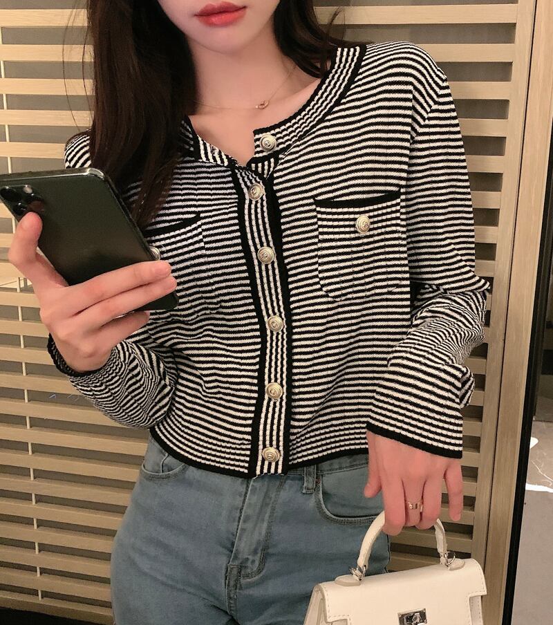 カラーラウンドネックボタンストライプセーター スプリングカーディガントップス レディース 春物 Oネック ビッグFスモールZ韓国76612505643