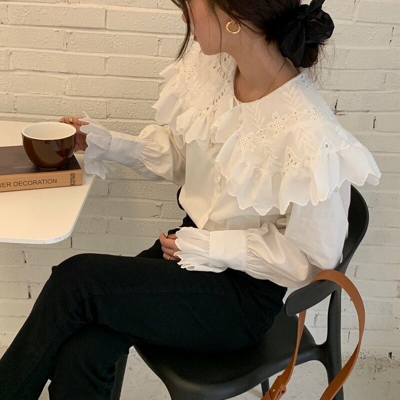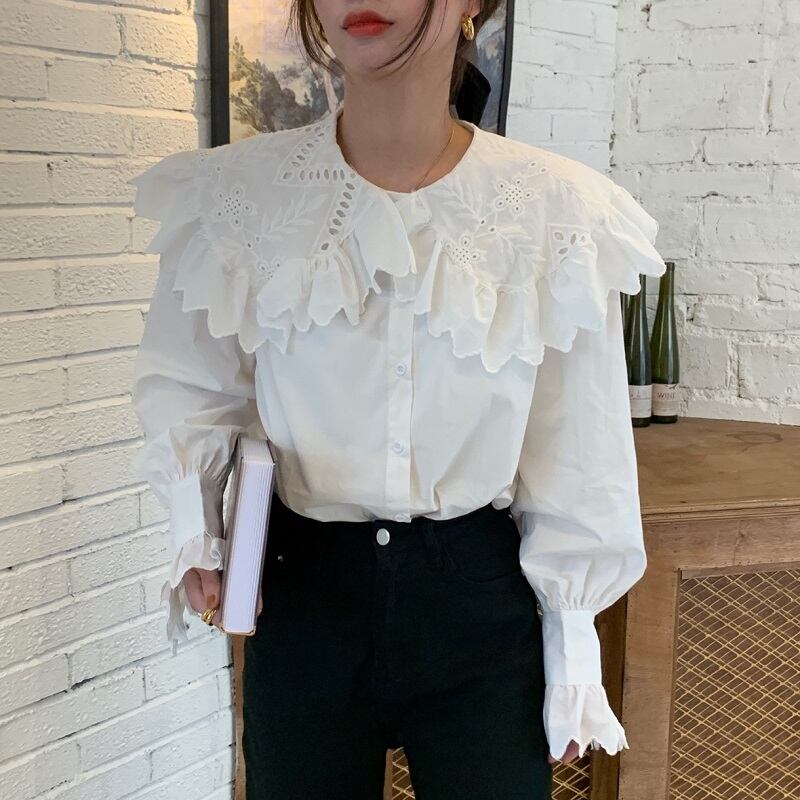 刺繍レースカラートップス ギャザースリーブスプリング長袖シャツ レディース ロング フレアスリーブ 春物 ビッグFスモールZ韓国60336475963