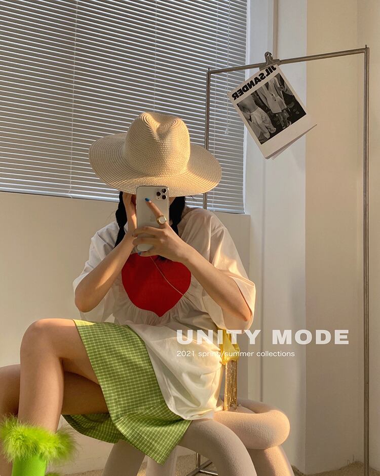 トップス レディースサマールーズラウンドネックレッドハートプリーツTシャツ スカート ストリート 夏物 Oネック ビッグFスモールZ韓国4584013653