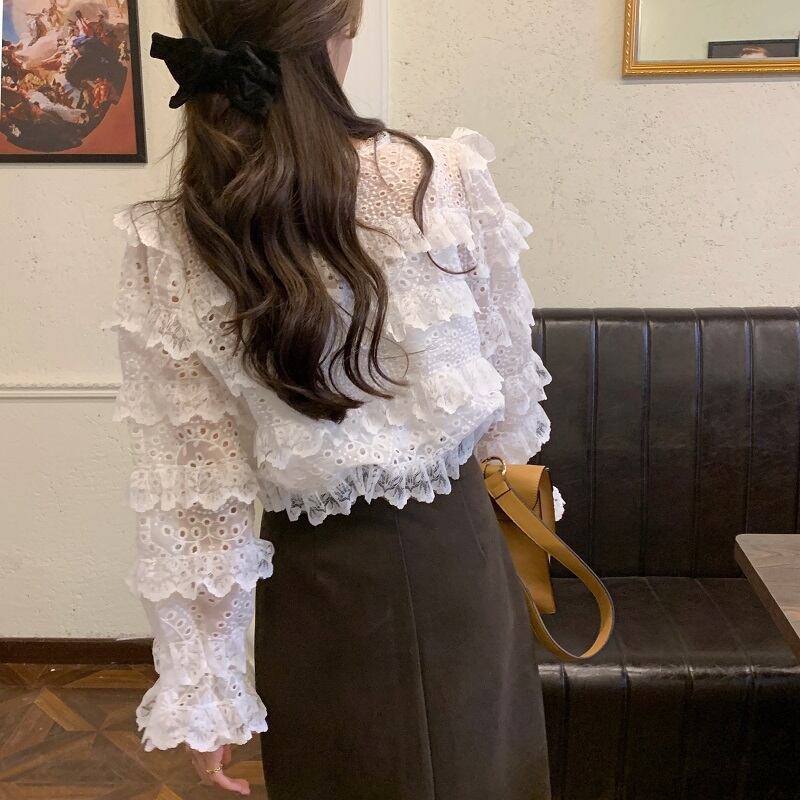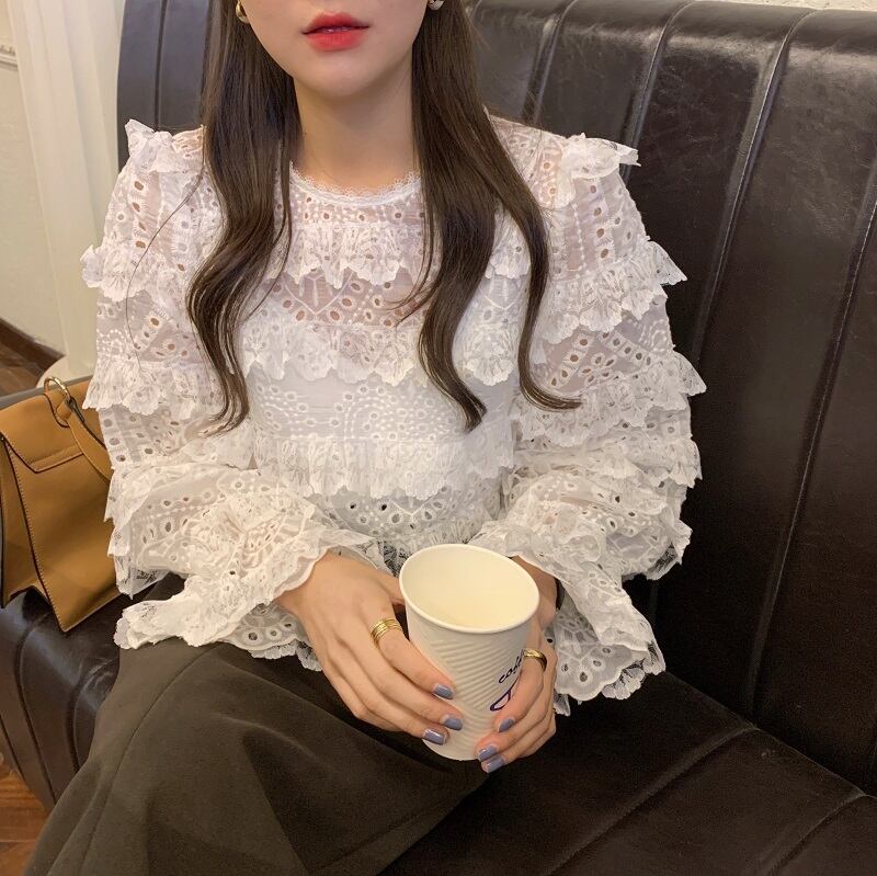 レーススタンドカラーカラースプリングシャツ トップス レディース ロング 大人ガーリー スウィート キュート カジュアル 春物 ビッグFスモールZ韓国25543974058