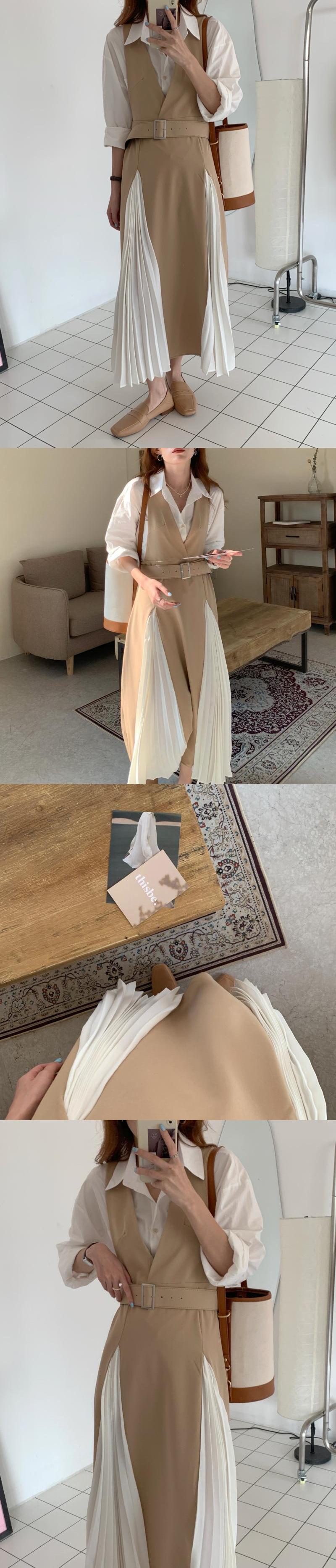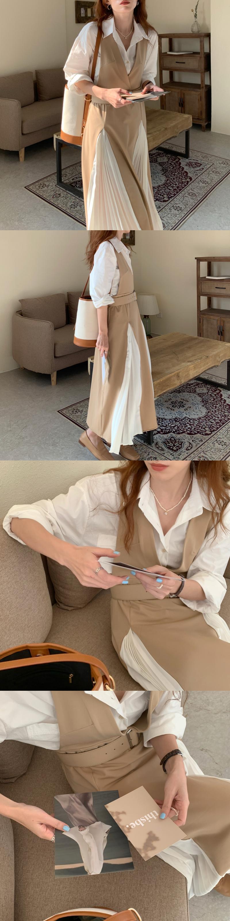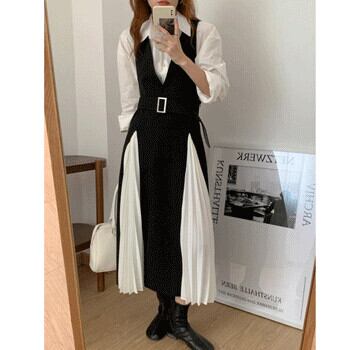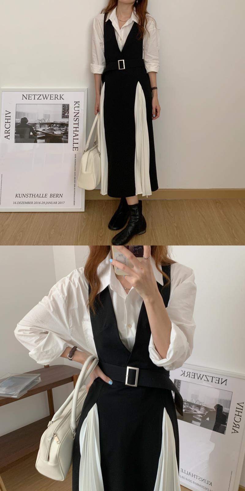 プリーツスカート シャツ ベルト ドレス ロング ハーネス ステッチ ビッグFスモールZ韓国91440837607