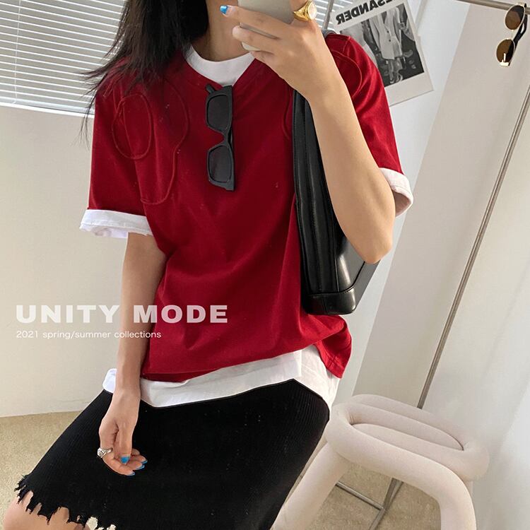 レッドTシャツ サマールーズラウンドネックプルオーバー トップス 夏物 Oネック ビッグFスモールZ韓国47525403270