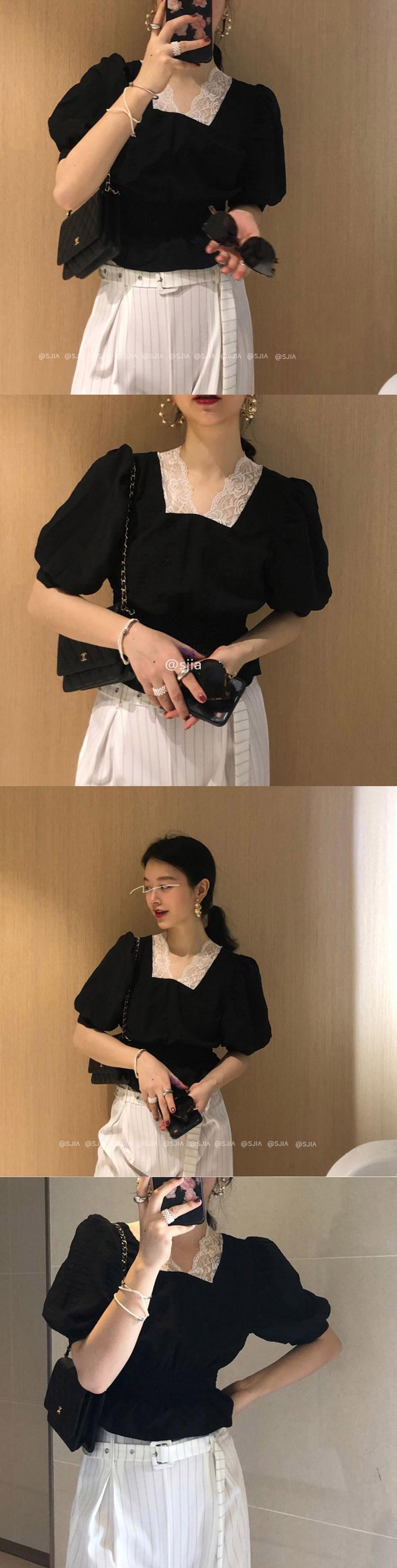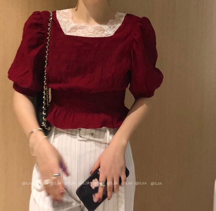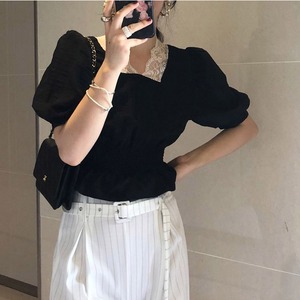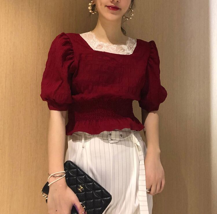 レースカラートップス レディースサマーショートハイウェストウェスト薄手スリーブプリーツシャツ 夏物 スクウェア ステッチ ビッグFスモールZ韓国8559138306