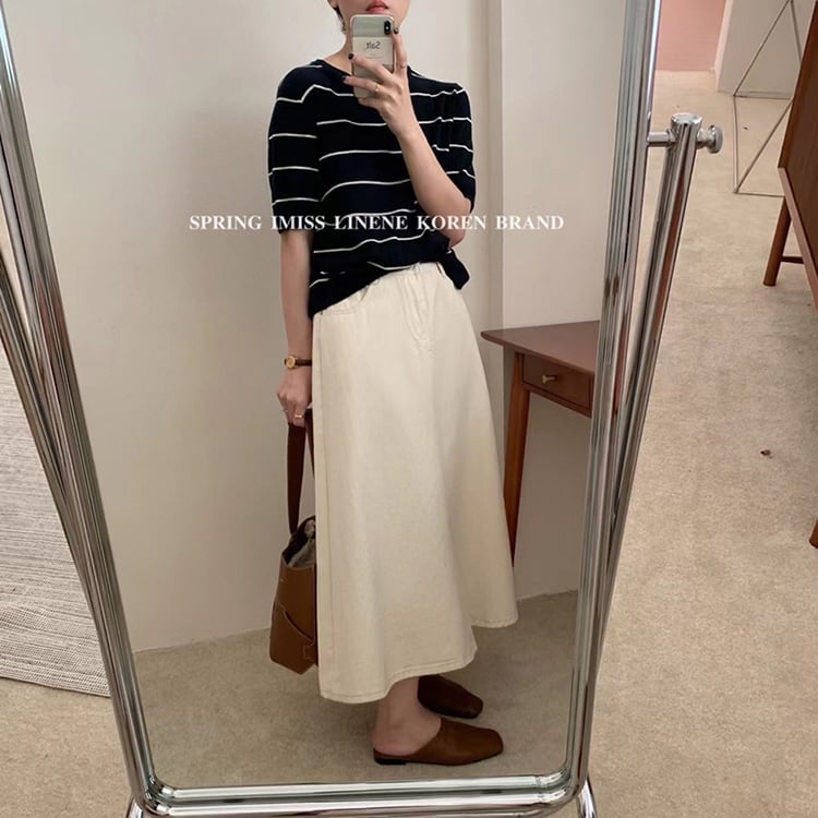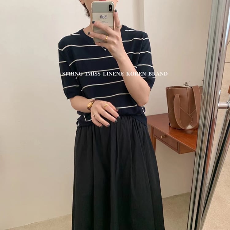 ニットTシャツ サマーカジュアルルーズストライプラウンドネックトップス 夏物 Oネック ビッグFスモールZ韓国29607995257