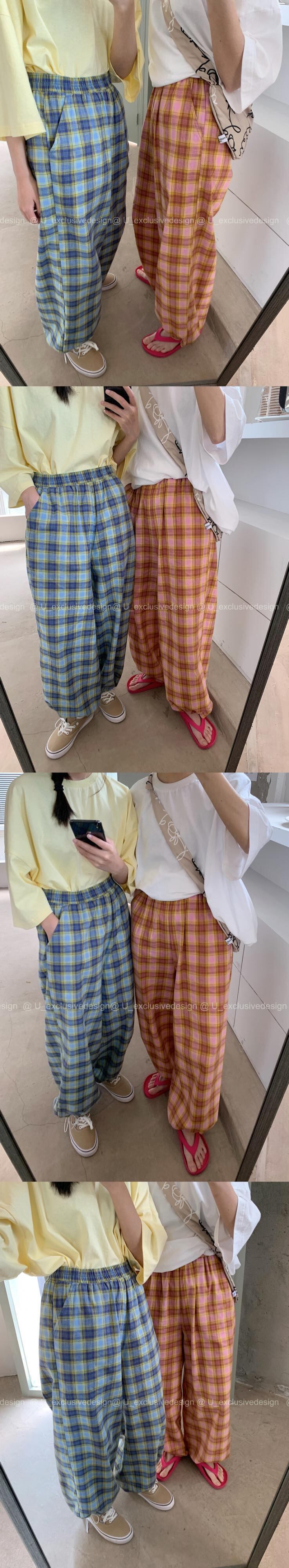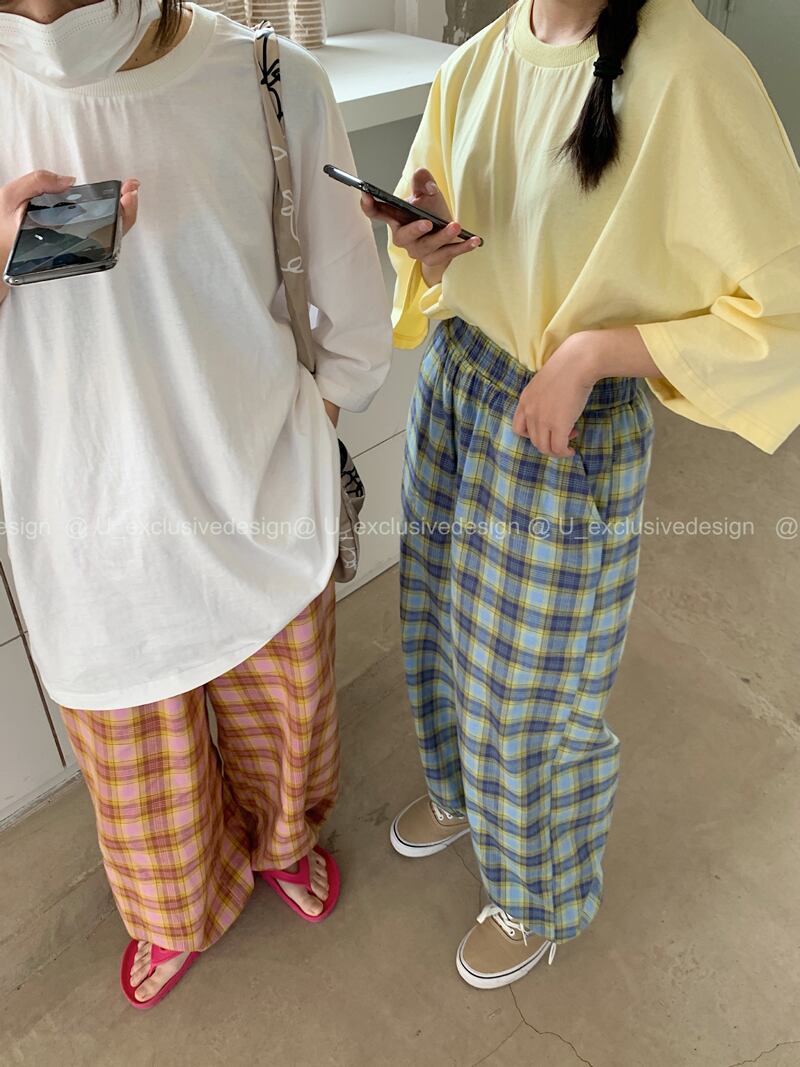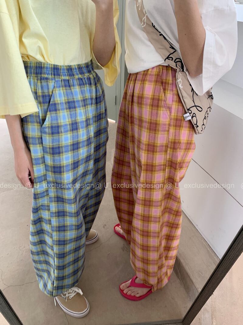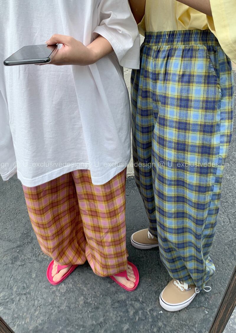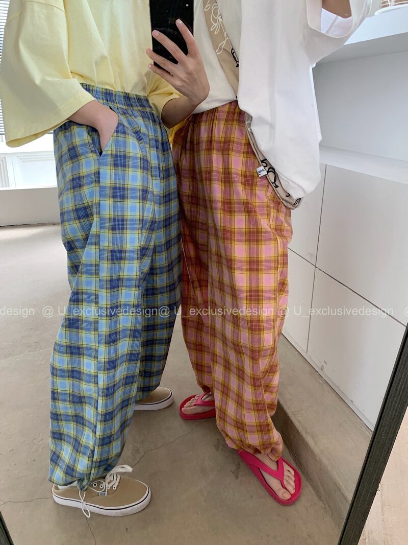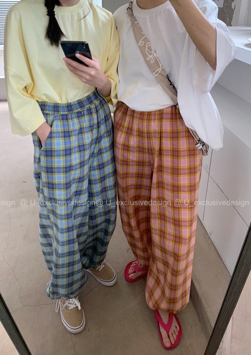 スタンダードカラー格子柄パンツ ストレッチウェストルーズ レトロ エラスティック 伸縮 ショーツ ブルマー ビッグFスモールZ韓国96994209281