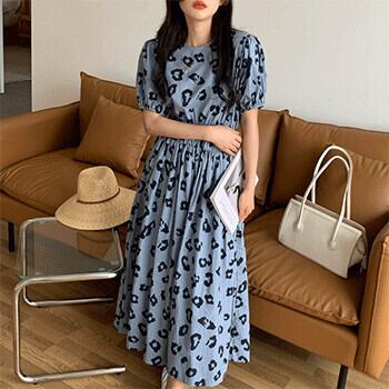 ハイウェストウェストドレス サマー薄手プリントラウンドネック半袖スリーブロングスカート ショート ハーフスリーブ 夏物 Oネック ビッグFスモールZ韓国82814767788