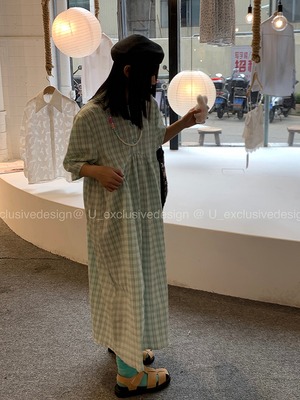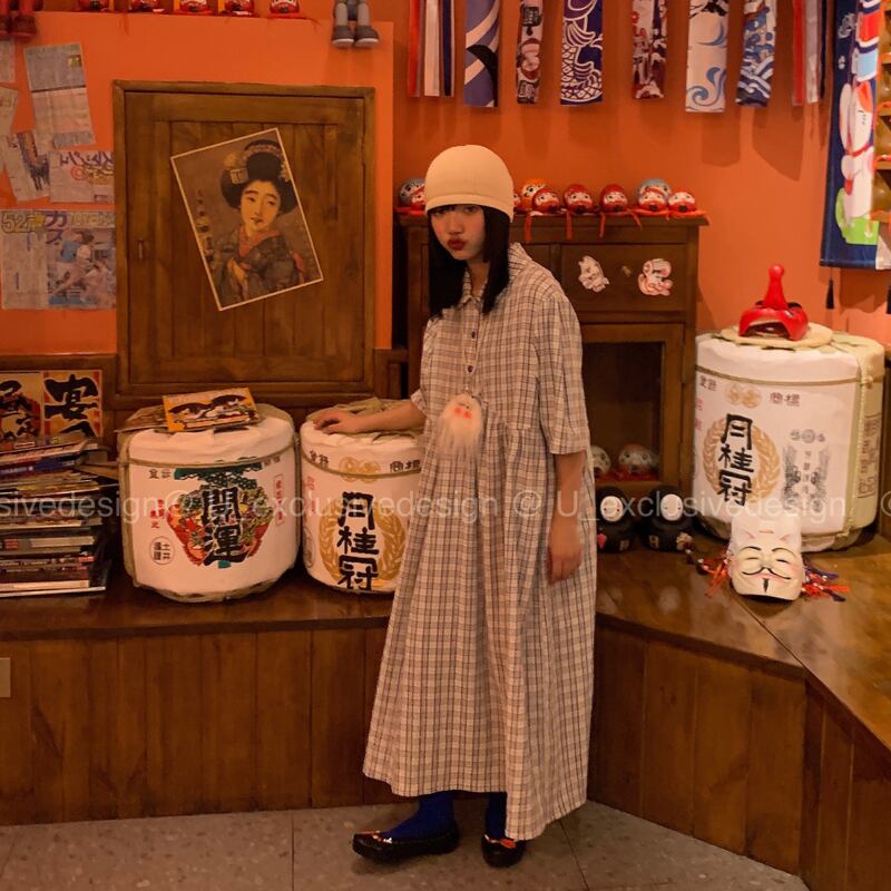シャツ カラー格子柄ルーズドレス サマーカジュアルハイウェストAラインスカート 夏物 ビッグFスモールZ韓国90396823294