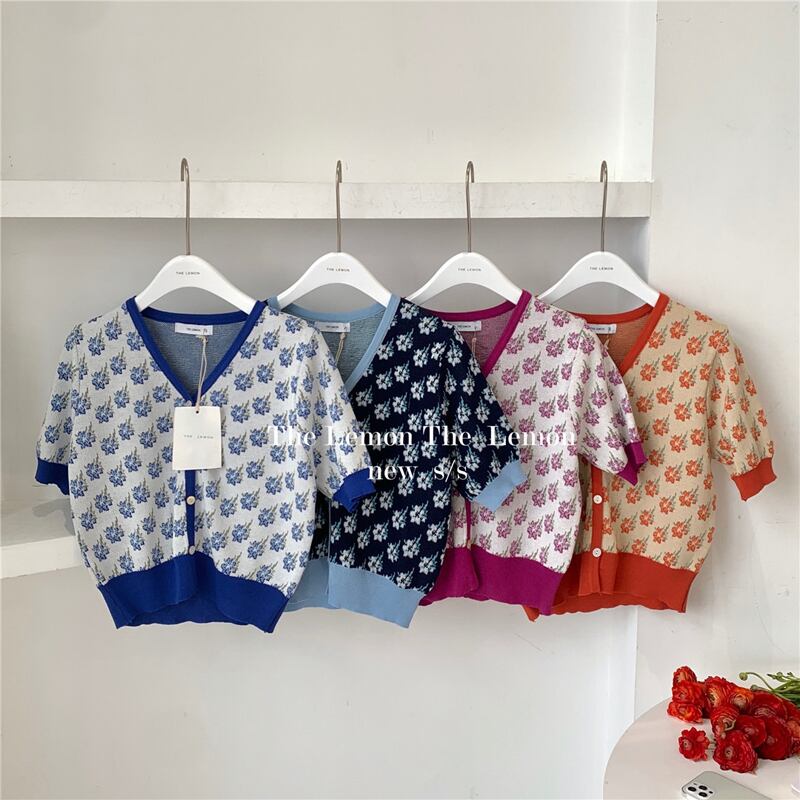 スタンダードカラーショートニットセーター シングルVネックカーディガンシャツ レディースサマー レトロ 夏物 ビッグFスモールZ韓国97128727753