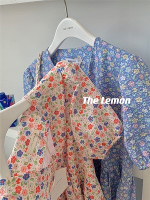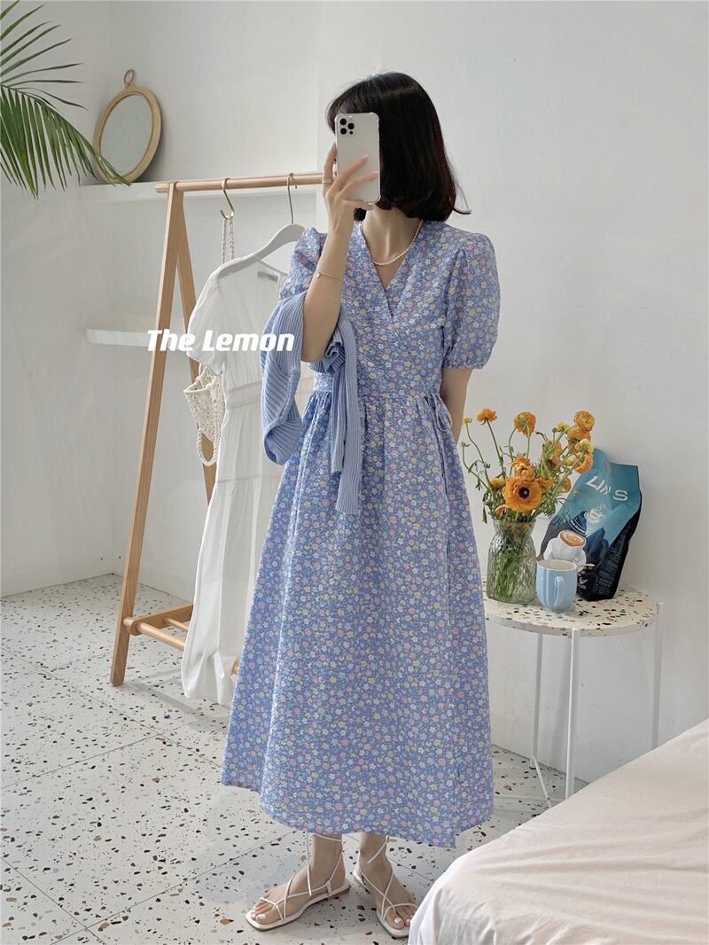 サイドフローラルスカート スタンダードVネックドレス サマーロング レトロ 夏物 花柄 ビッグFスモールZ韓国31431165694