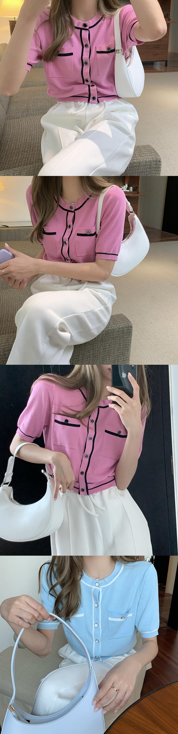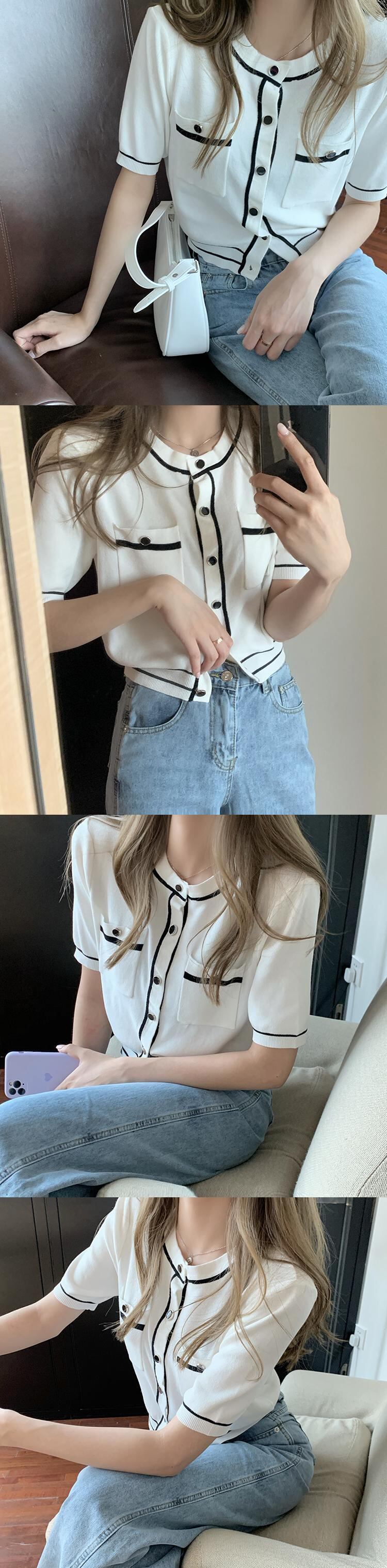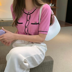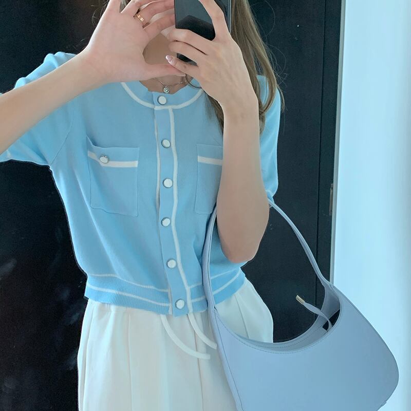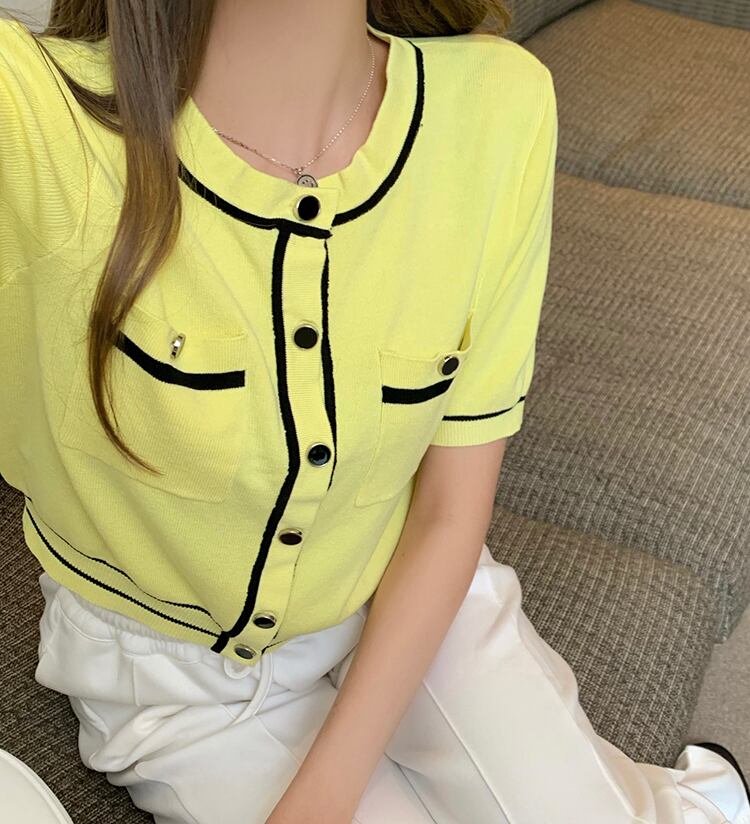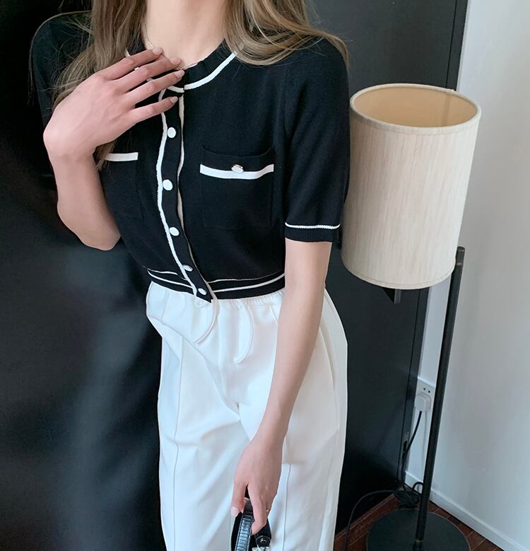ニットカーディガンサマールーズ薄手ショートラウンドネックブラックトップス 夏物 Oネック ステッチ ビッグFスモールZ韓国86464680733