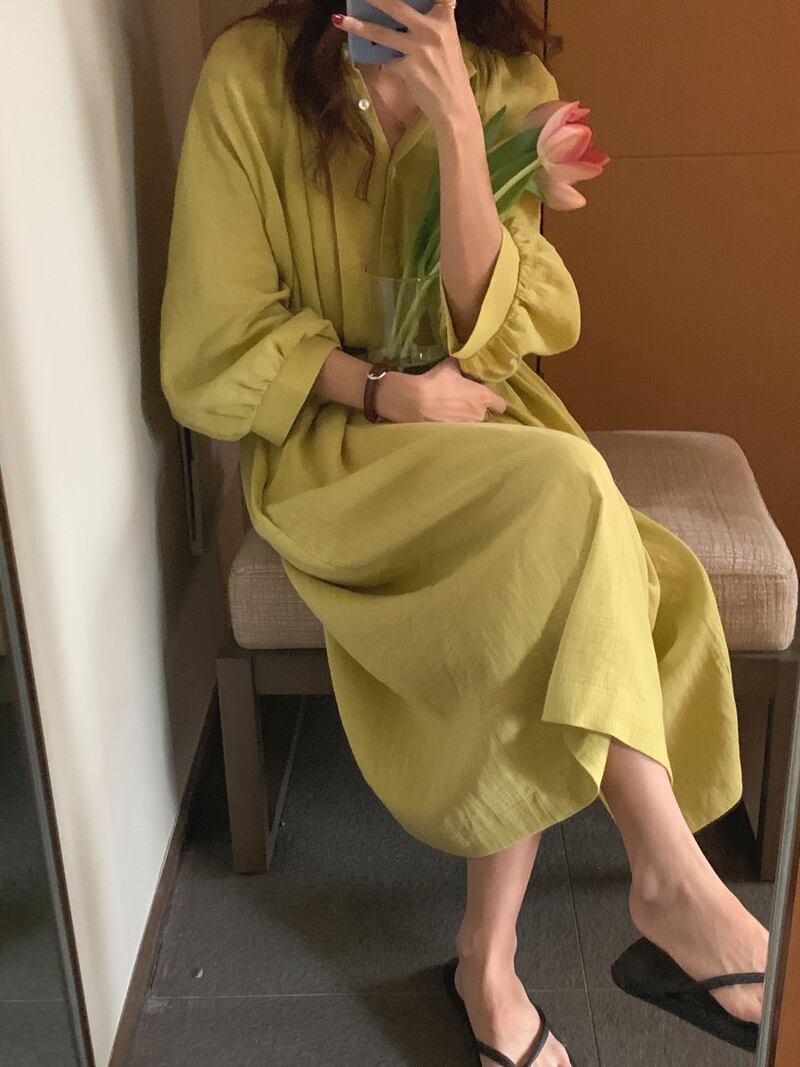 カラースタンダードレースドレス ルーズボタン長袖スリーブ ロング レトロ レースアップ ビッグFスモールZ韓国33857770785