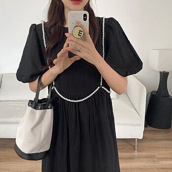 パールチェーン プリーツドレス レディースサマールーズ半袖スリーブラウンドネックウェストスカート ショート ハーフスリーブ 夏物 Oネック 真珠 ビッグFスモールZ韓国366664531