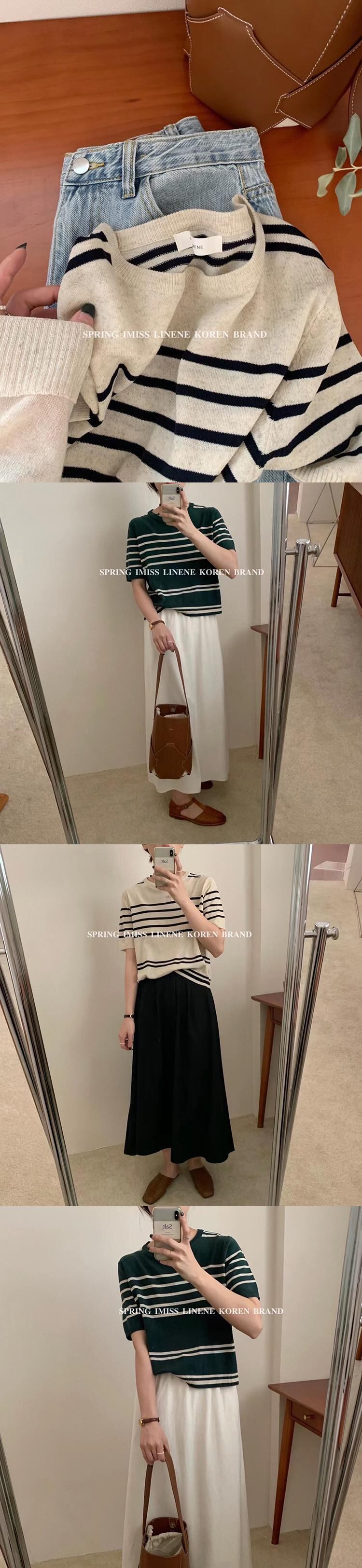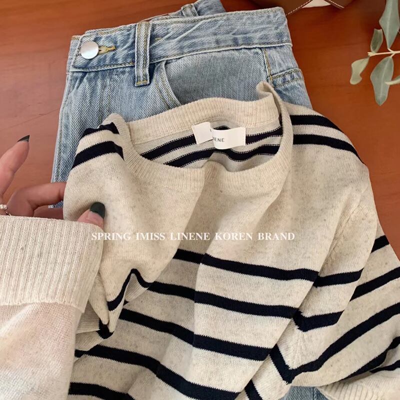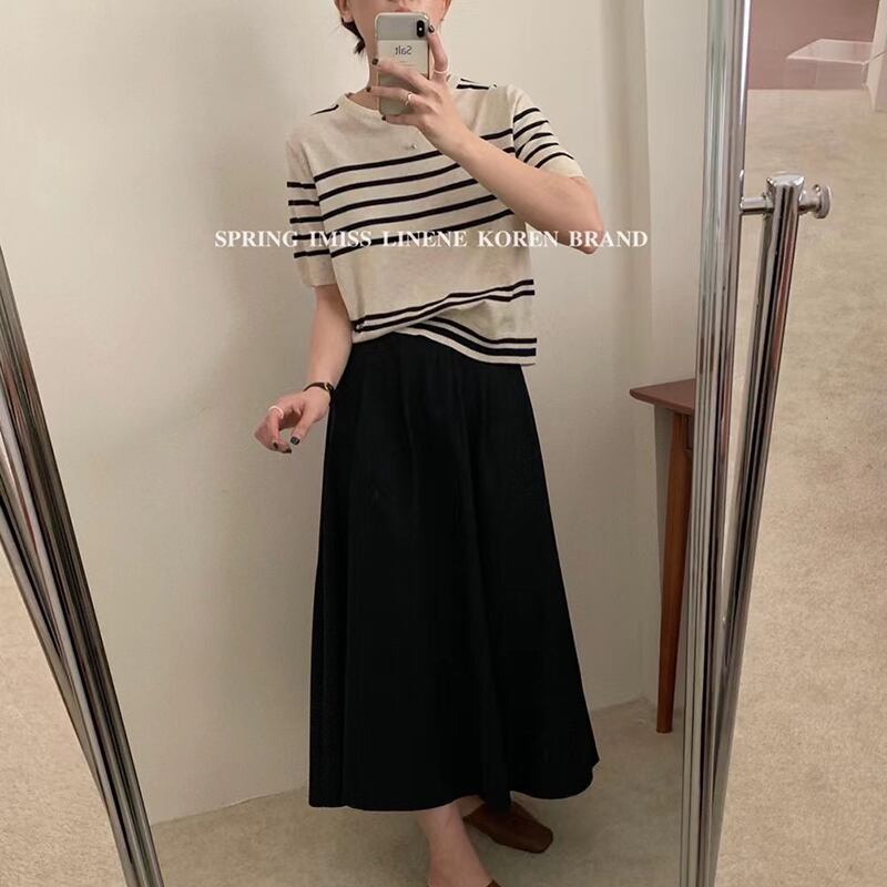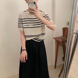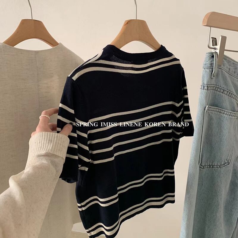 ラウンドネックニットサマー薄手ルーズブラックストライプTシャツ 夏物 Oネック ビッグFスモールZ韓国47311440177