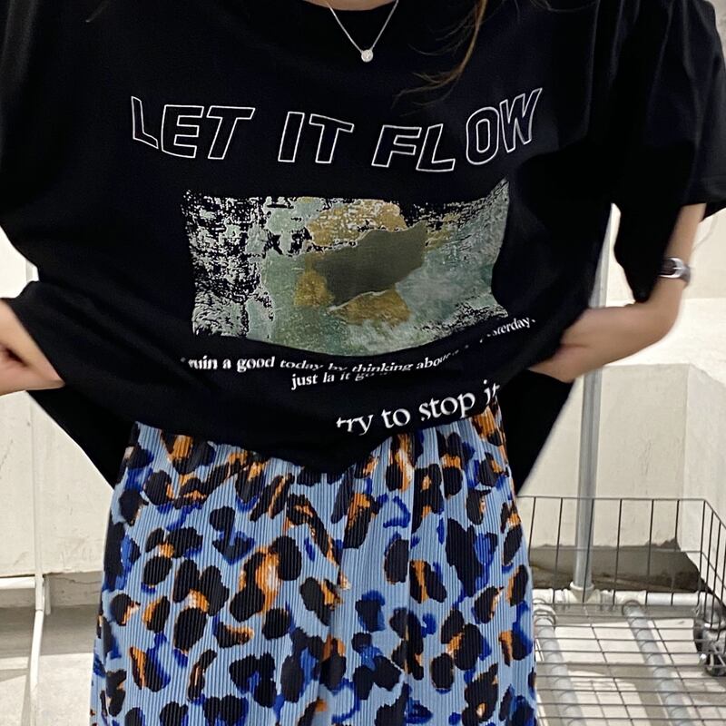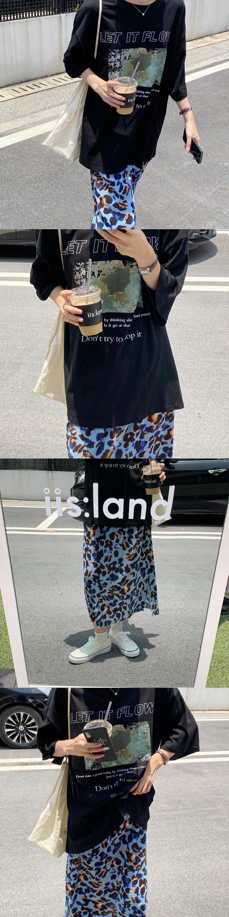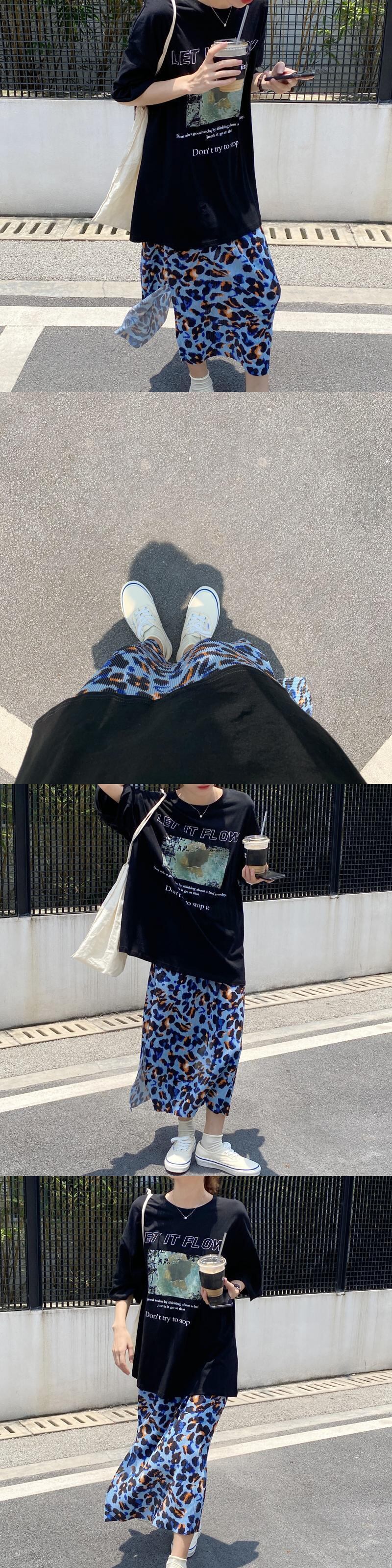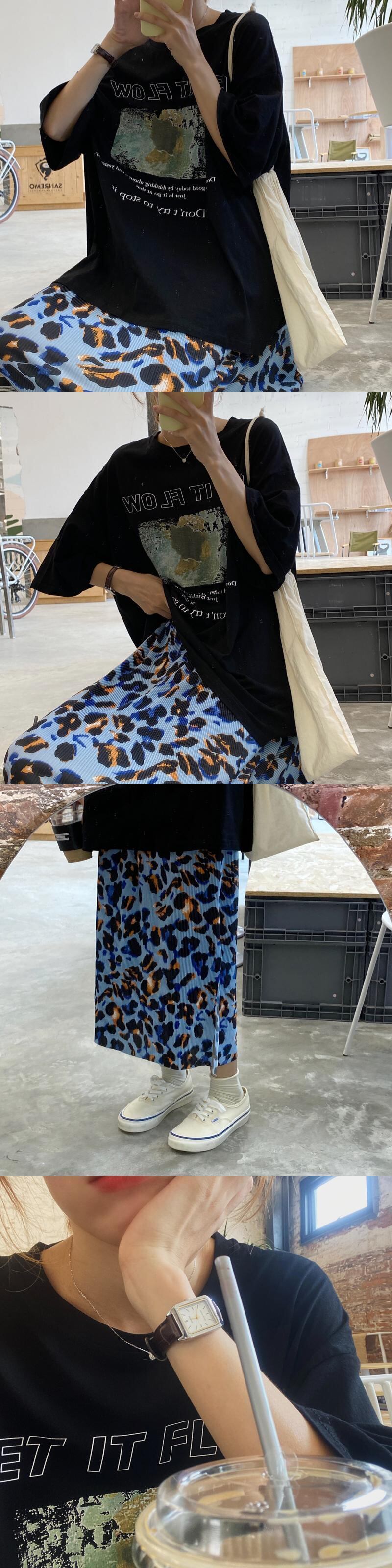セット ラウンドネックルーズTシャツ トップス レオパードプリント柄プリーツスカート レディース Oネック ビッグFスモールZ韓国1896117018