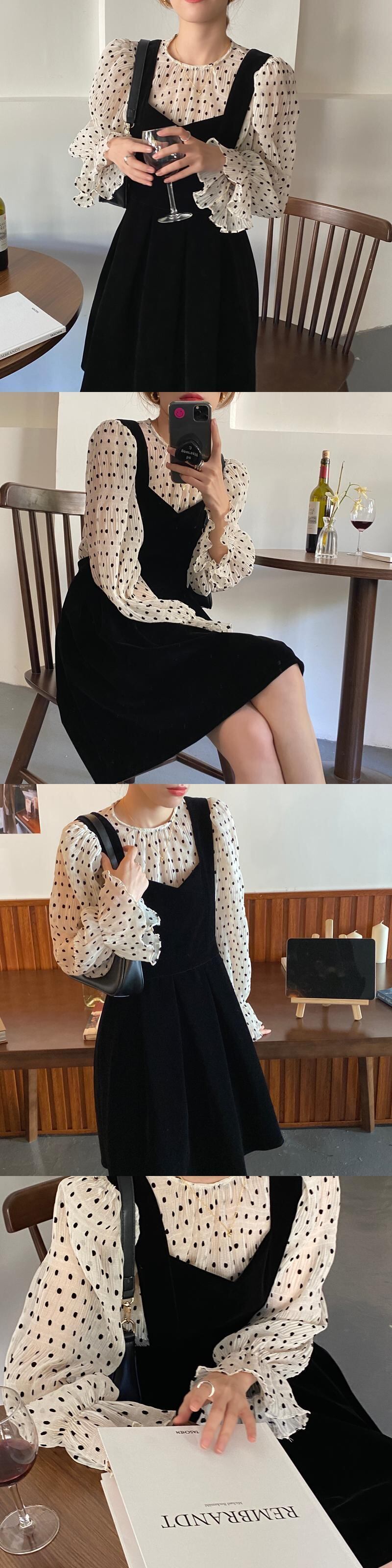 水玉長袖スリーブシャツ 薄手Vネックドレス レディース ロング ビッグFスモールZ韓国58619558164