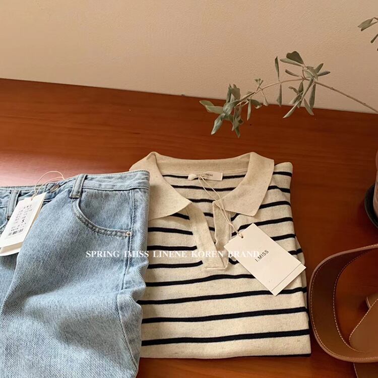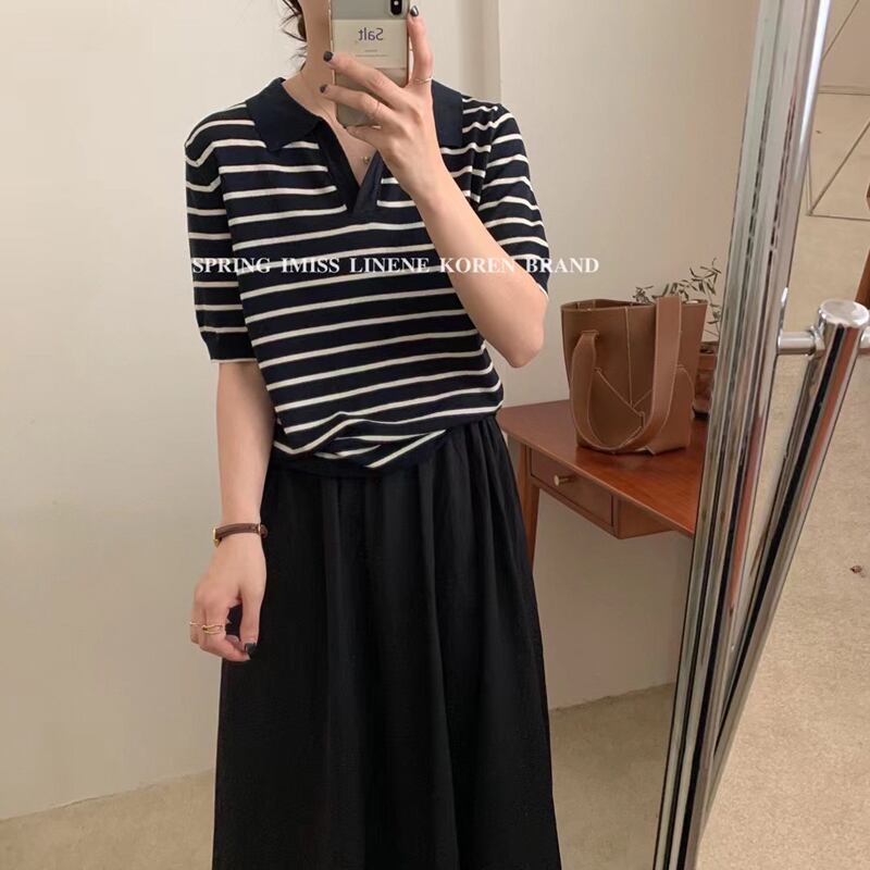 ニット半袖スリーブシャツ サマーブラックストライプルーズトップス ショート ハーフスリーブ 夏物 ビッグFスモールZ韓国95428463477