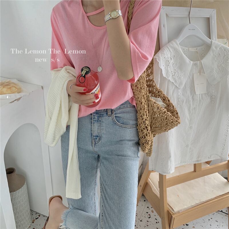 カラーソリッド ルーズ半袖スリーブTシャツ サマートップス レディース ショート ハーフスリーブ 夏物 ソリッドカラー ビッグFスモールZ韓国4109899418