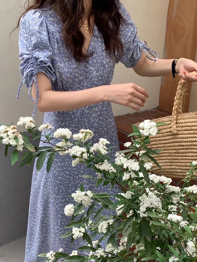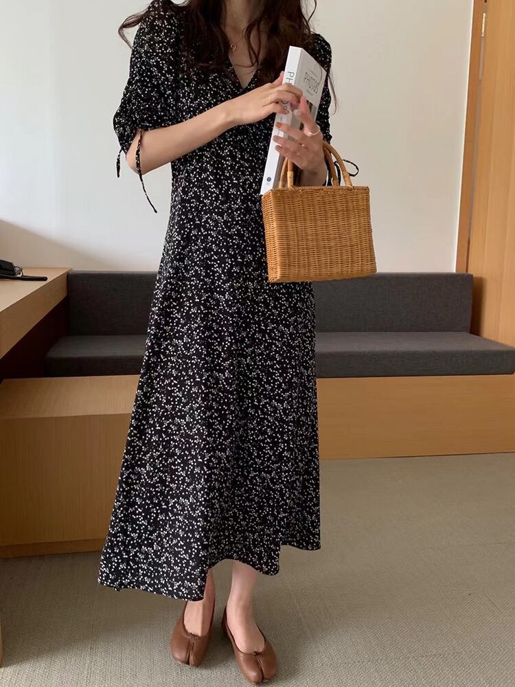 スリムドレス サマースタイルVネックギャザーミディスカート 夏物 ビッグFスモールZ韓国1802149505