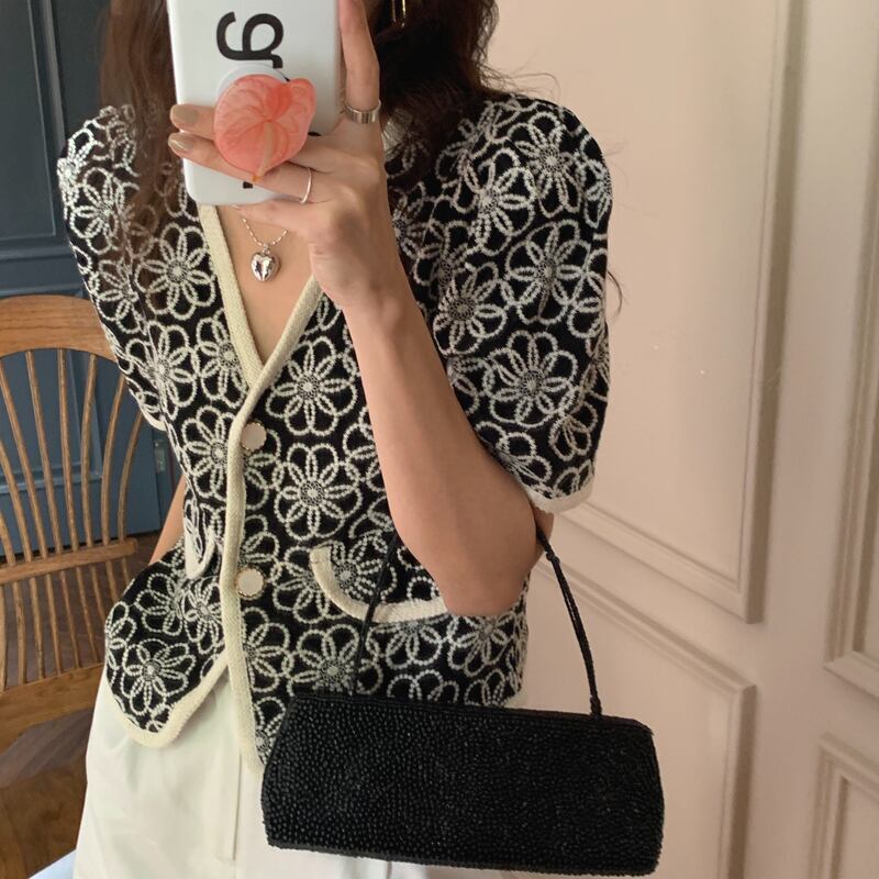 カーディガンジャケット サマースタイル薄手Vネックスリーブショート レッド 刺繍 夏物 ビッグFスモールZ韓国70725635756