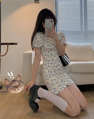 ドレス サマーショートスリム薄手半袖スリーブプリーツフローラル ハーフスリーブ 夏物 花柄 スクウェア ビッグFスモールZ韓国14993728522