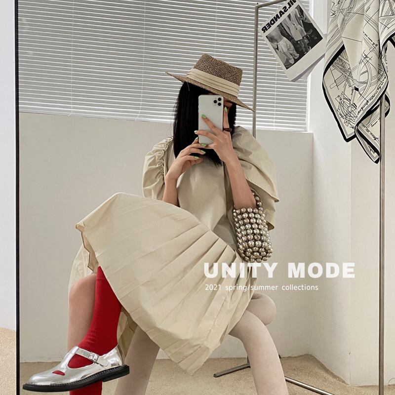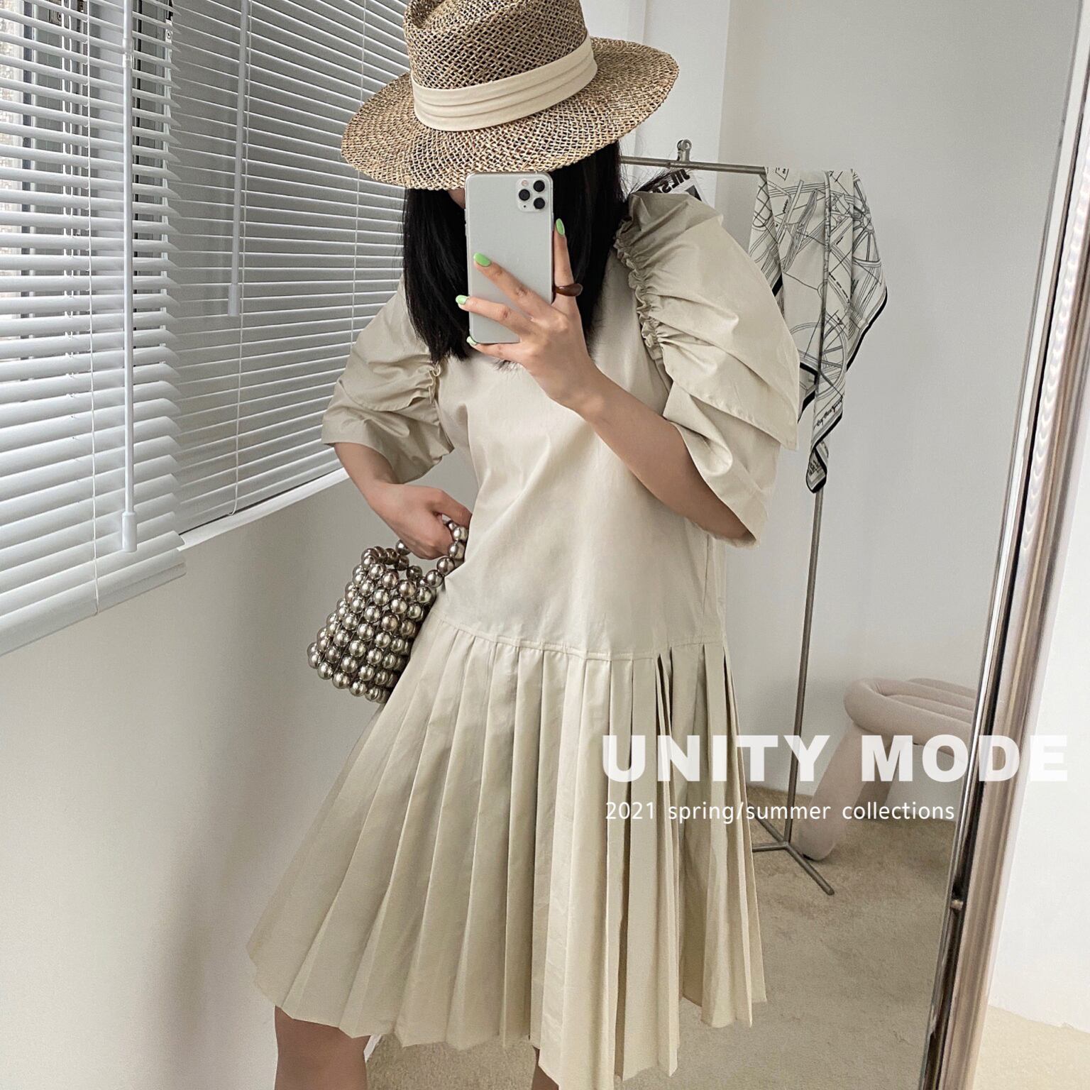 プリーツスリーブドレス サマーラウンドネックAラインロングスカート 夏物 Oネック ステッチ ビッグFスモールZ韓国30959152162