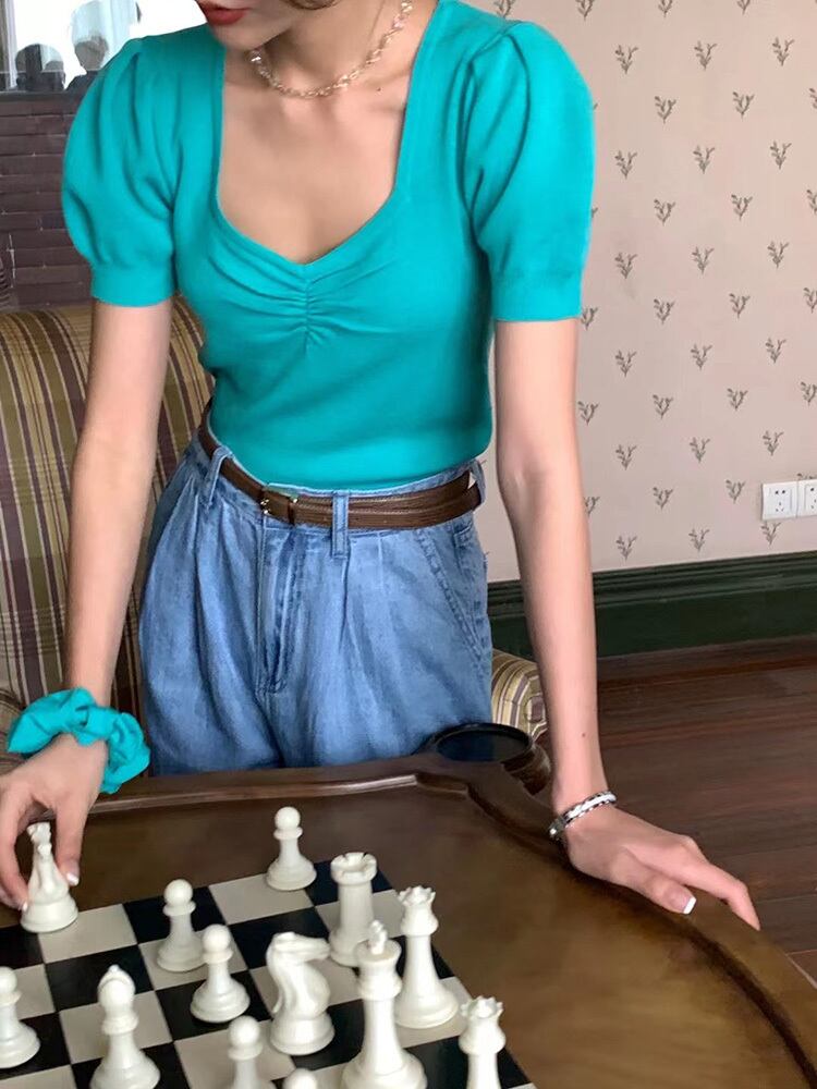リング ニットセーター トップス サマースタイルスリムVネックプリーツスリーブ薄手 夏物 シルク 指輪 ビッグFスモールZ韓国9123207704